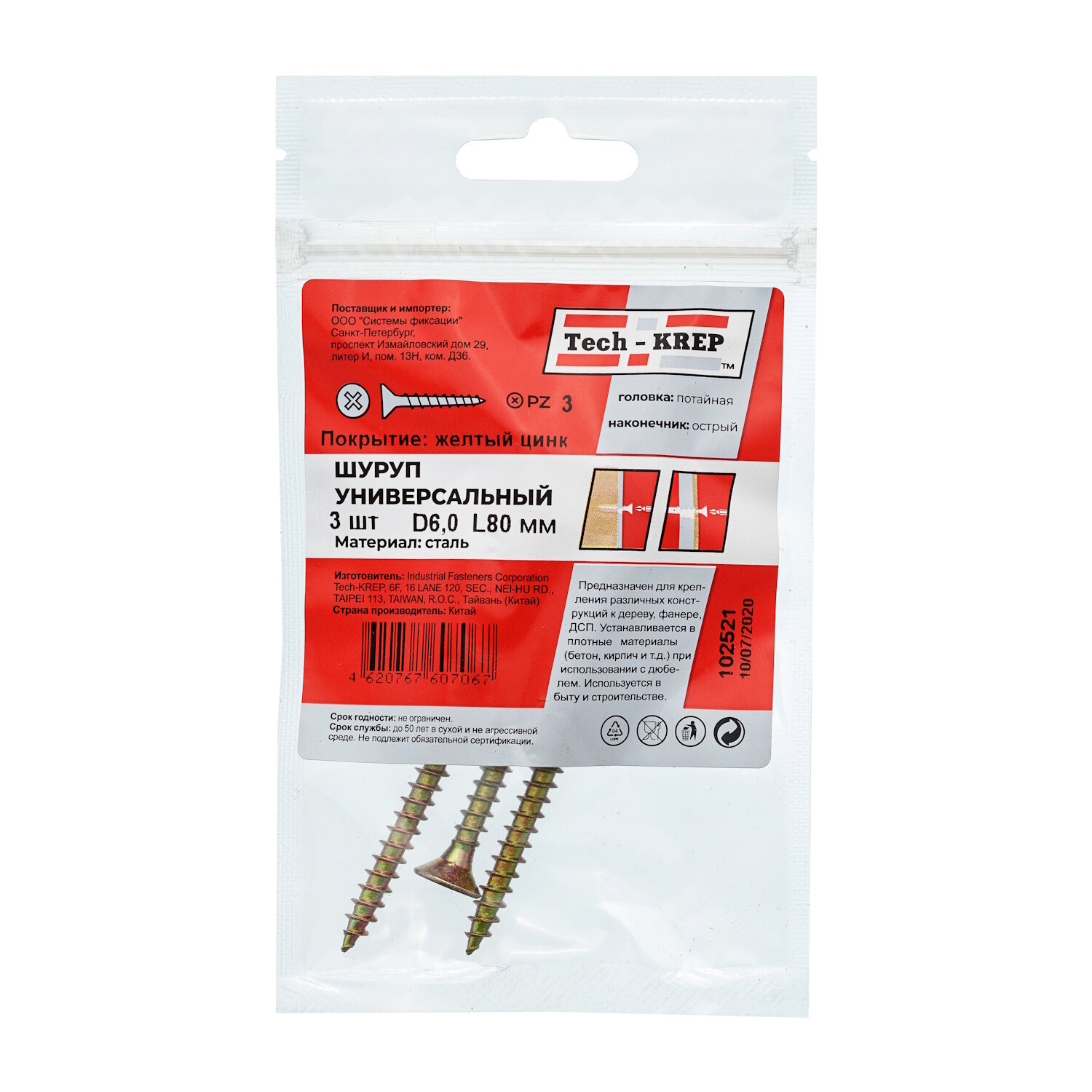 Саморез ШУж Tech-Krep 60х80 с потайной головкой 3 шт в пакете