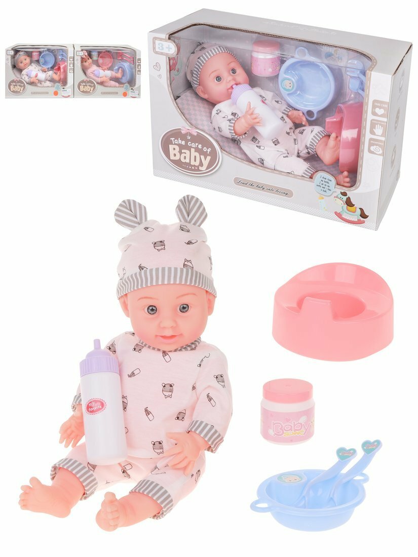 Кукла умеет пить настоящую воду и писать. Она одета в симпатичный комбинезон и чепчик. В наборе есть бутылочка, горшок, тарелочка, вилка, ложка, баночка.