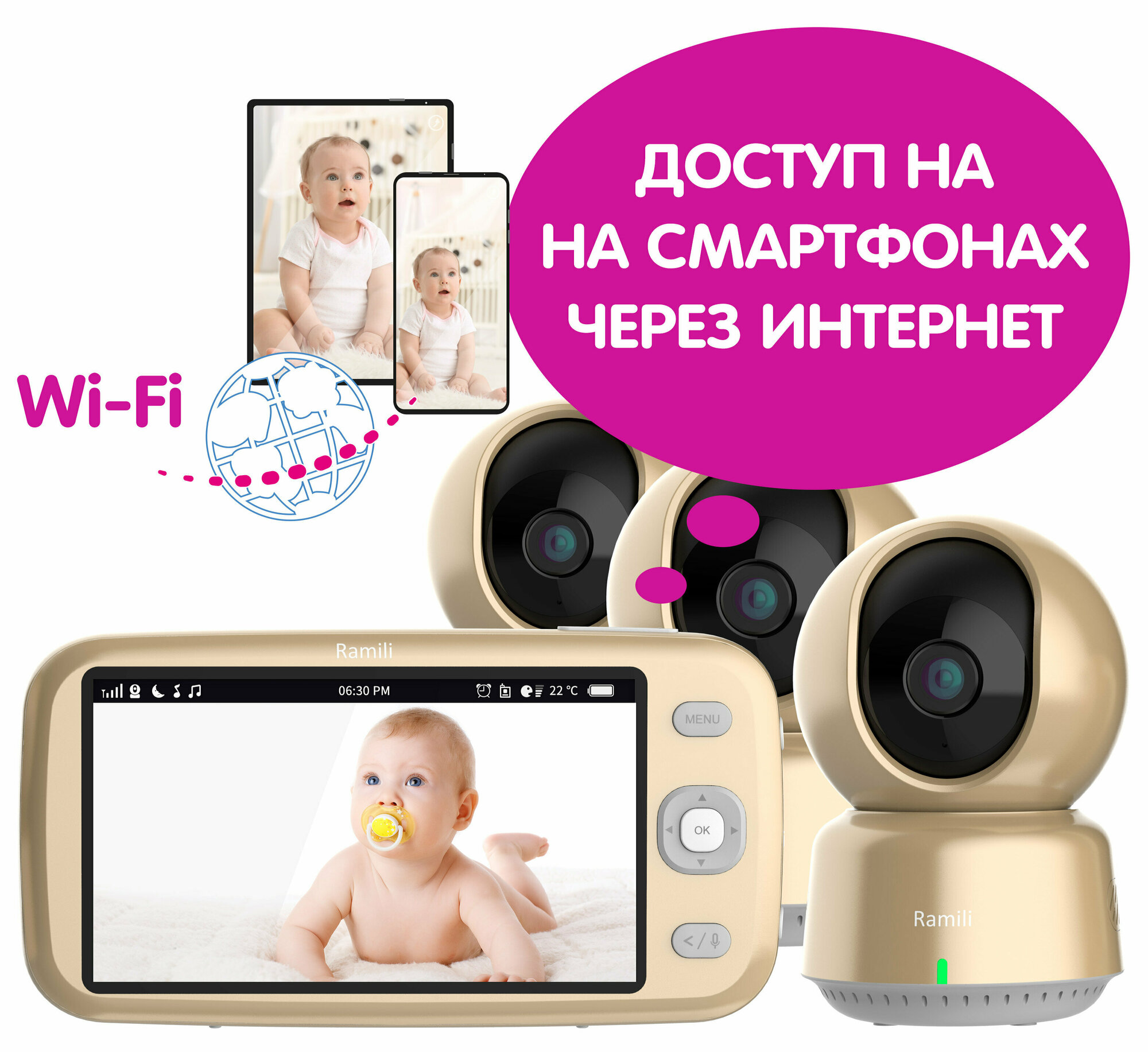 В комплект этой видеоняни входят три камеры. Видеоняня Ramili с доступом через интернет – это передовое устройство для присмотра за ребенком. Включает в себя камеру и монитор, которые позволяют наблюдать за малышом на расстоянии до 400 метров с родительского блока при оптимальных условиях для связи и на неограниченном расстоянии с экрана смартфона или планшета через удобное приложение из любой точки мира, обеспечивая спокойствие для родителей и безопасность для ребенка.