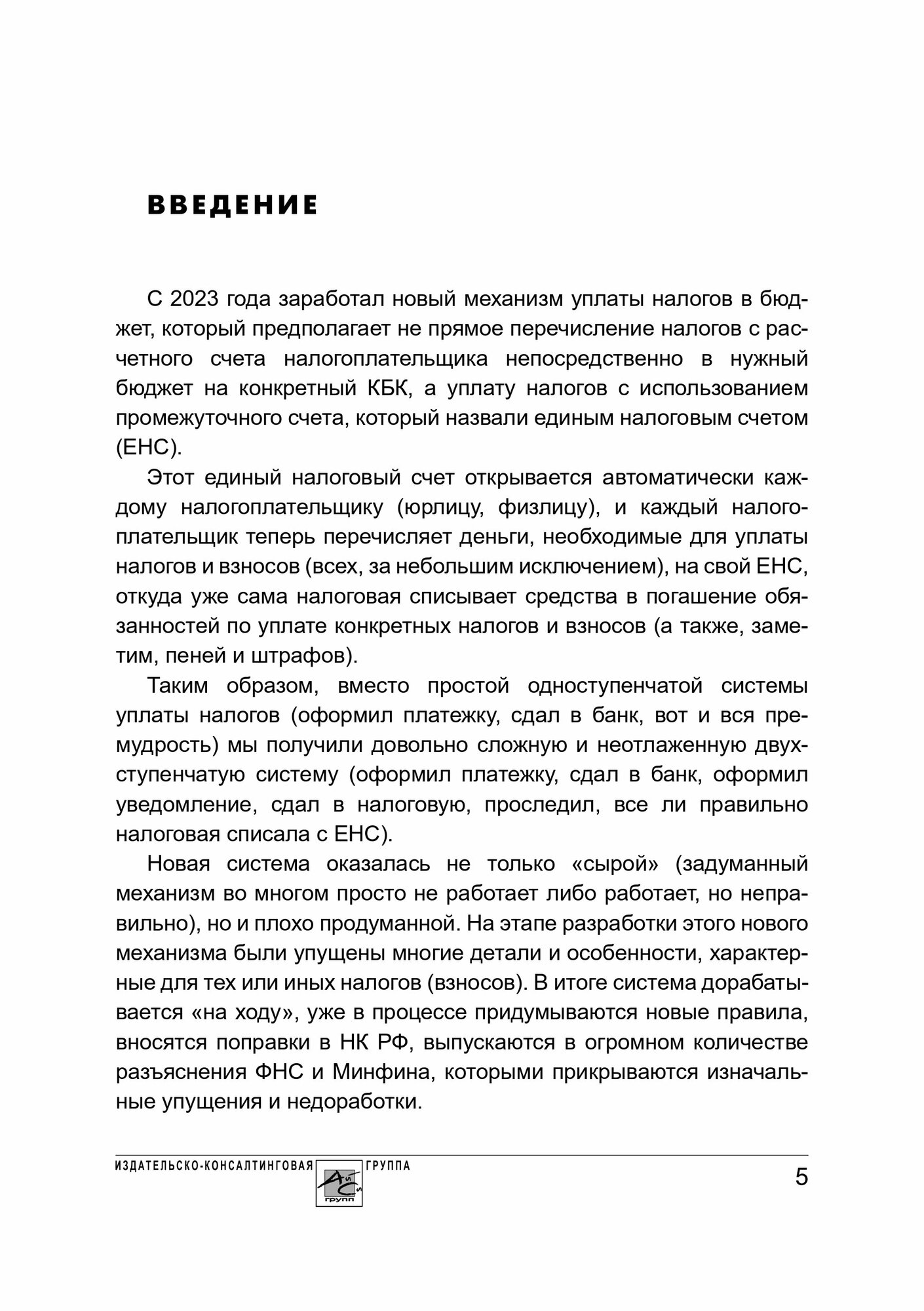 Задача данной книги – систематизировать практику применения нового механизма уплаты налогов и предостеречь налогоплательщиков от ошибок, которые впоследствии (надеемся, что рано или поздно механизм будет отлажен и налажен) затруднят сверку с налоговой и выход на правильное сальдо ЕНС. При подготовке книги учтены изменения, внесенные в НК РФ летом 2023 года.