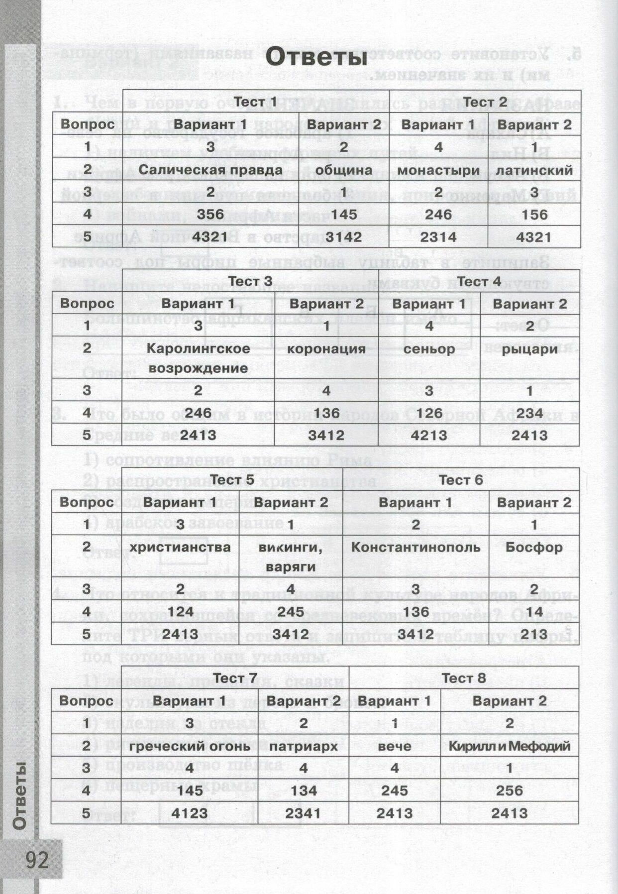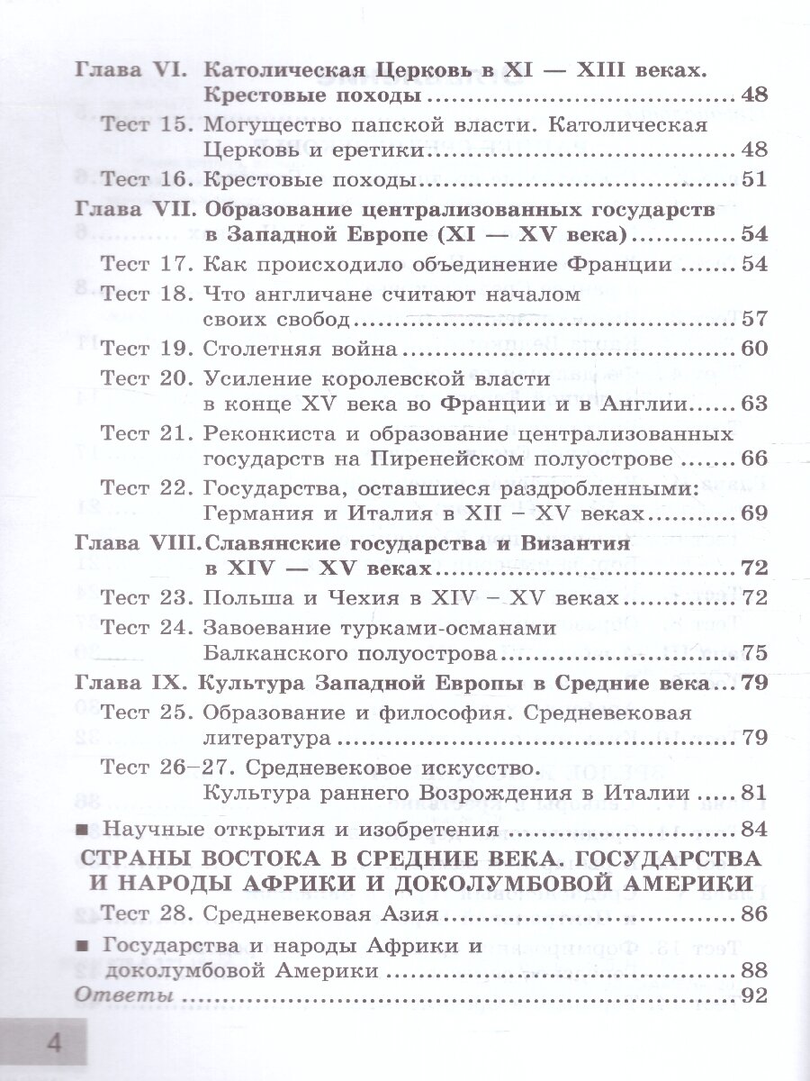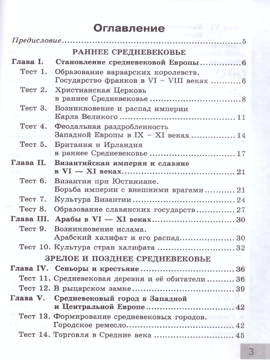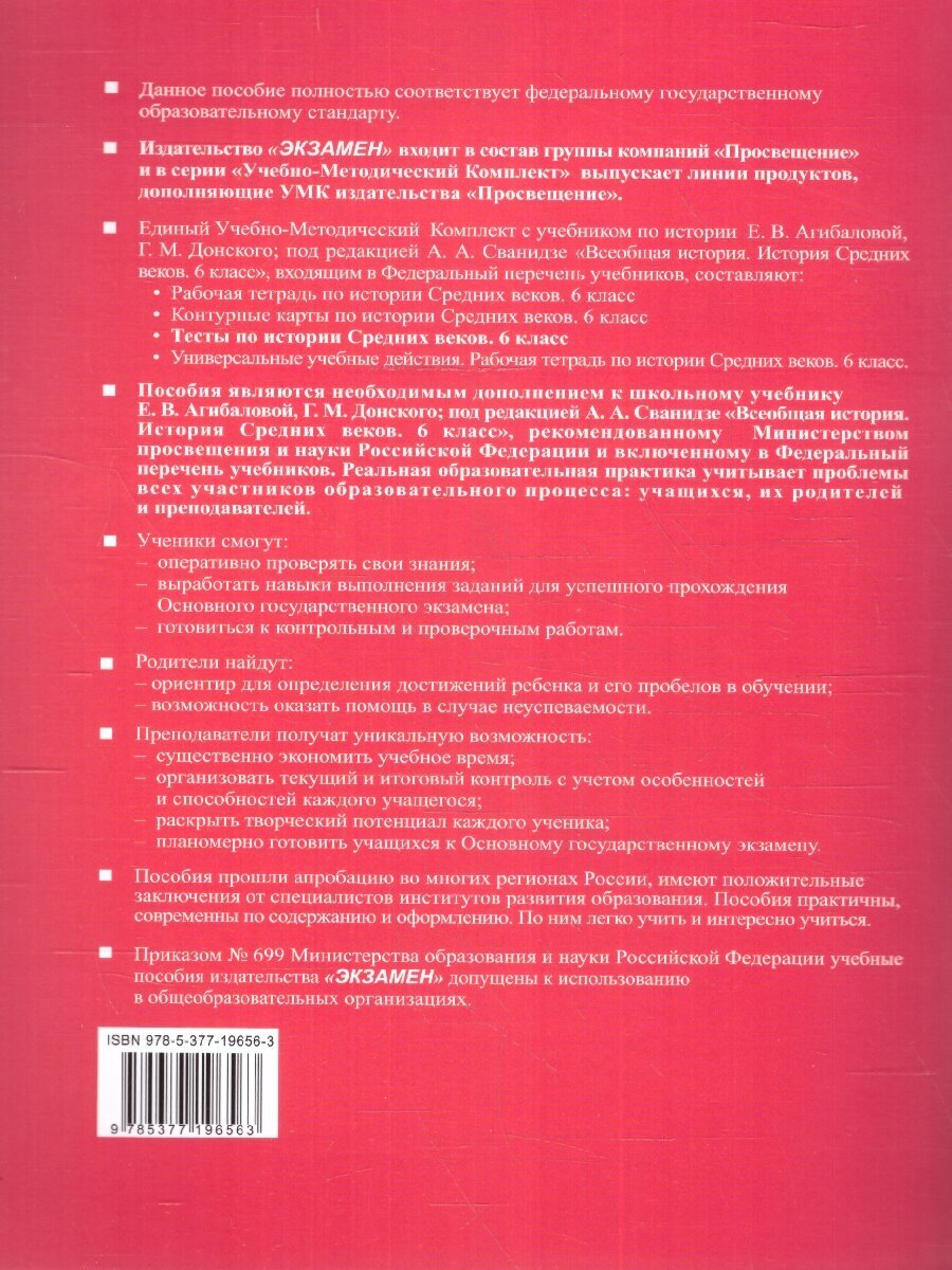 Пособие включает тесты по истории Средних веков для текущего и итогового контроля и соответствует содержанию учебника Е. В. Агибаловой, Г. М. Донского; под редакцией А. А. Сванидзе "Всеобщая история. История Средних веков" для 6 класса общеобразовательных организаций. Многие тестовые задания разработаны с учётом требований Основного государственного экзамена в 9 классе. Они помогут учащимся освоить новые для них виды тестов и подготовиться к будущим устным и письменным экзаменам.