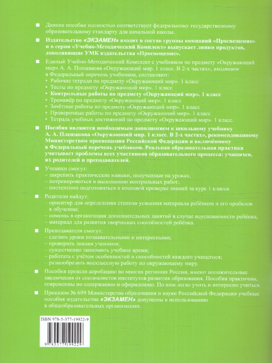 Окружающий мир. 1 класс. Контрольные работы к учебнику А. А. Плешакова. Часть 1 (Крылова Ольга Николаевна, Цитович Галина Ивановна); Экзамен, 2024