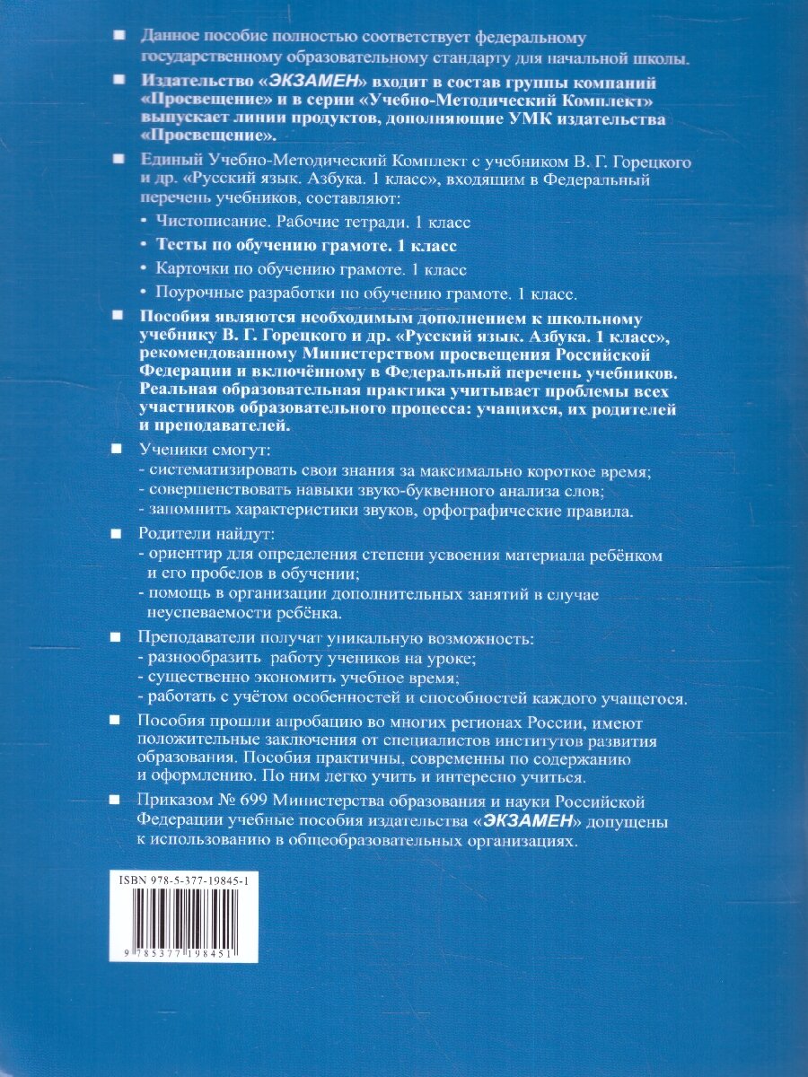 Тесты по обучению грамоте помогут учащимся в изучении и систематизации учебного материала за максимально короткое время. Они способствуют не только быстрой проверке знаний, но и более глубокому усвоению программы, тренируют ученика по разным направлениям грамматических умений, совершенствуют навыки звуко-буквенного анализа слов, расширяют словарный запас, помогут запомнить характеристику звуков, орфографические правила, изучаемые в первом классе, развивают устную и письменную речь, воображение ребёнка.