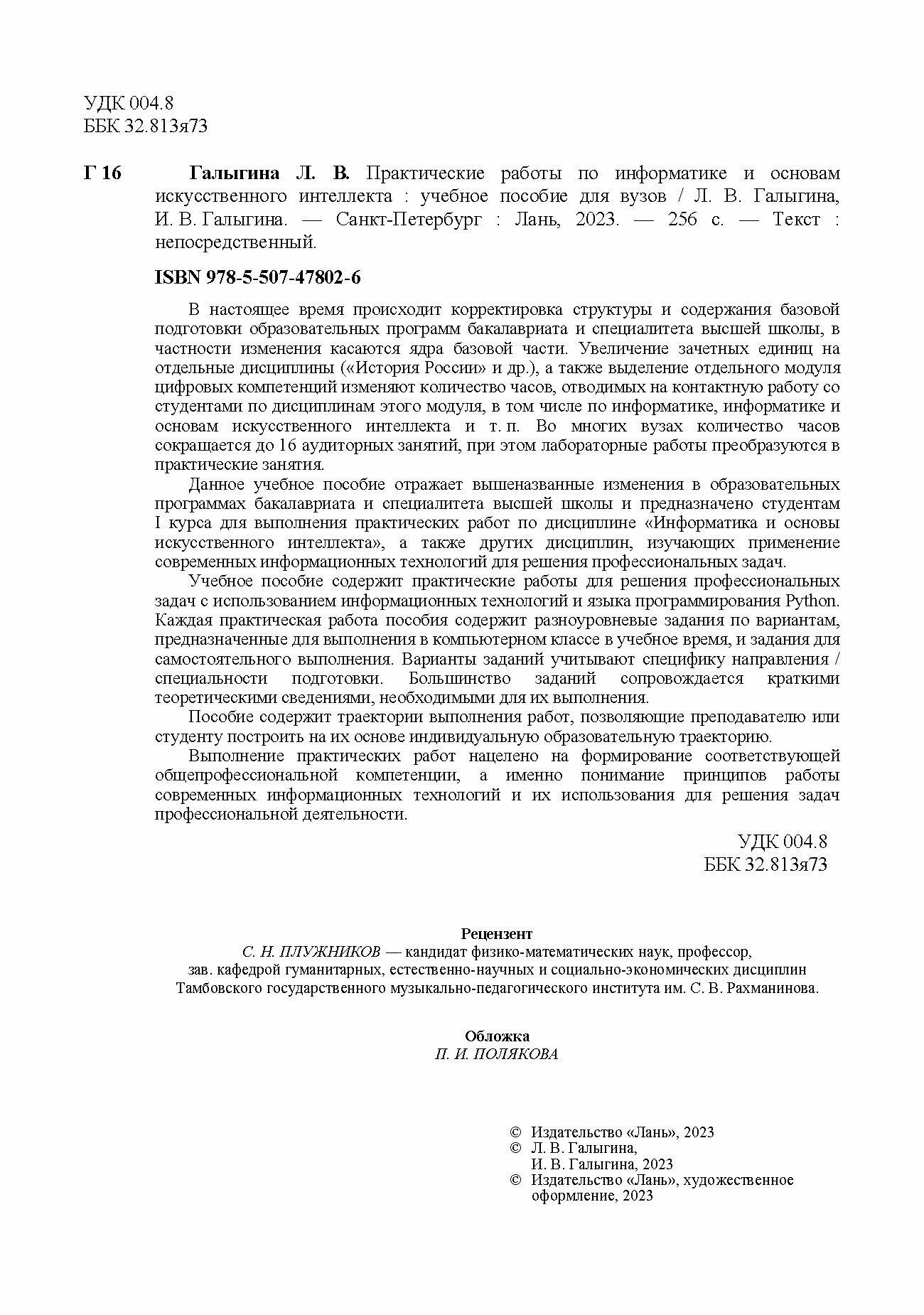 Практические работы по информатике и основам искусственного интеллекта. Учебное пособие (Галыгина Ирина Владимировна, Галыгина Лилия Владимировна); Лань, 2023