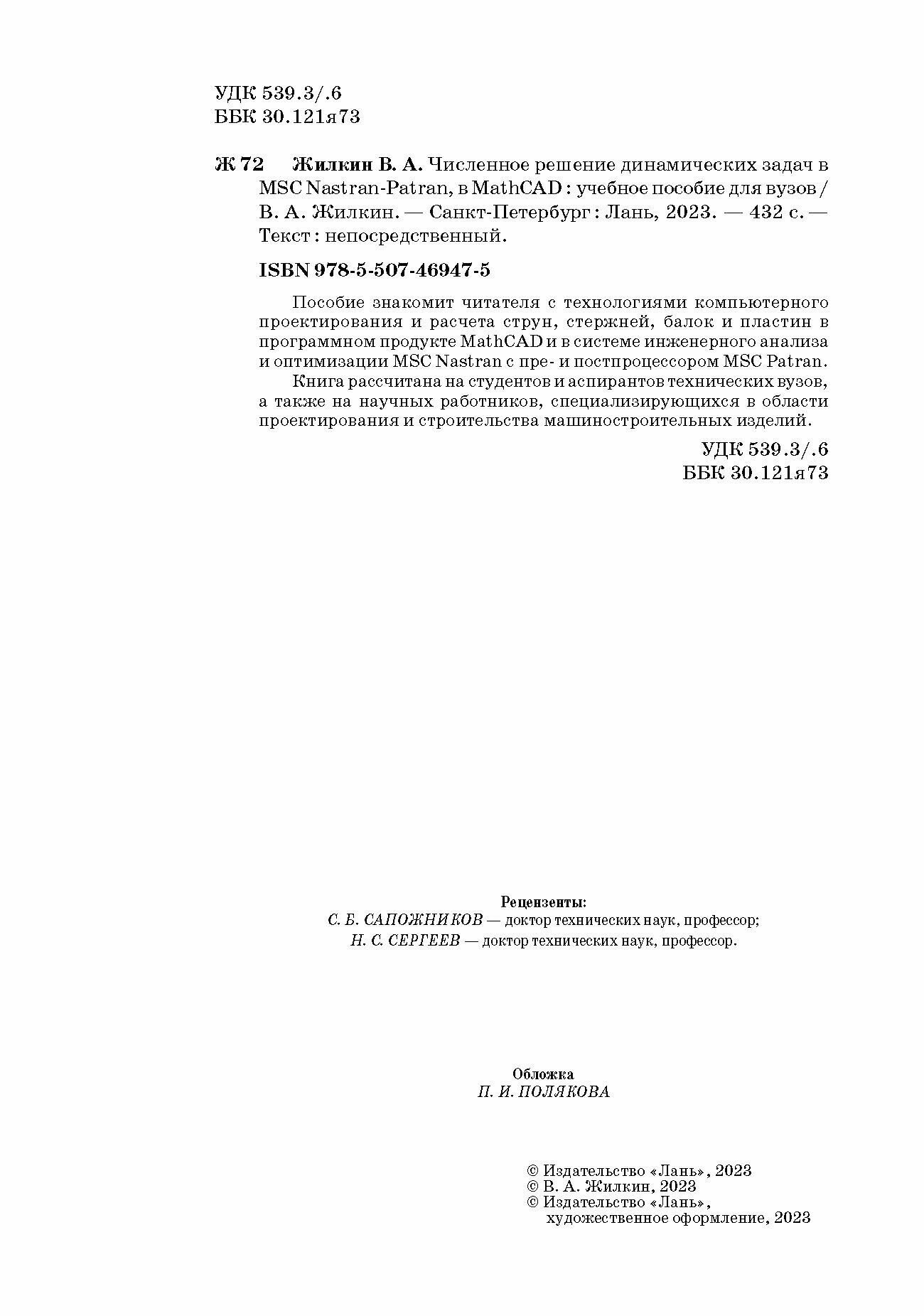 Численное решение динамических задач в MSC Nastran-Patran в MathCAD. Учебное пособие (В. А. Жилкин); Издательство ЛАНЬ, 2023