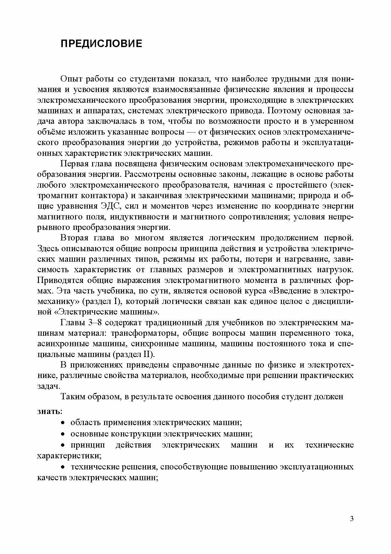Книга включает два раздела: «Введение в электромеханику» (главы 1, 2), где изложены физические основы электромеханического преобразования энергии, общие вопросы устройства и работы электрических машин; «Трансформаторы и электрические машины» (главы 3–8), содержащий традиционный для рассматриваемого курса материал. В отдельную главу вынесены специальные машины — вентильные, линейные, универсальные.