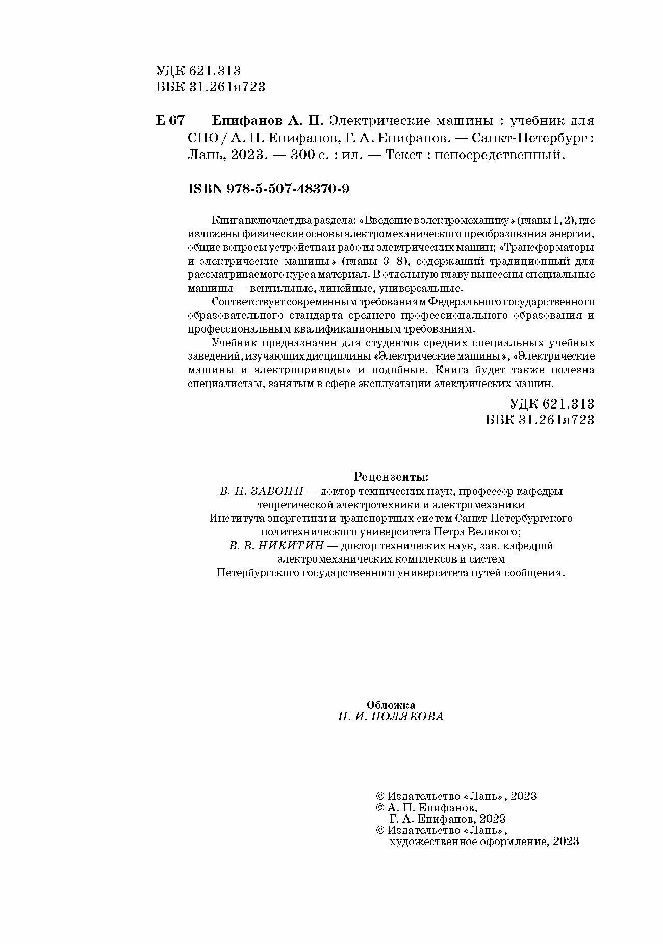 Электрические машины. Учебник. СПО (Епифанов Алексей Павлович, Епифанов Григорий Алексеевич); Лань, 2023