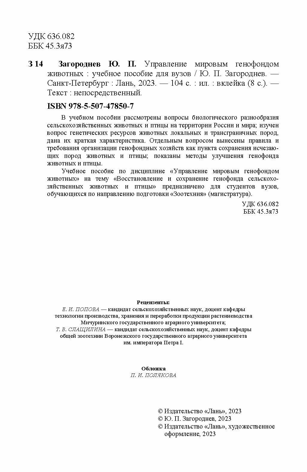 Управление мировым генофондом животных. Учебное поссобие (Ю. П. Загороднев); Издательство ЛАНЬ, 2023