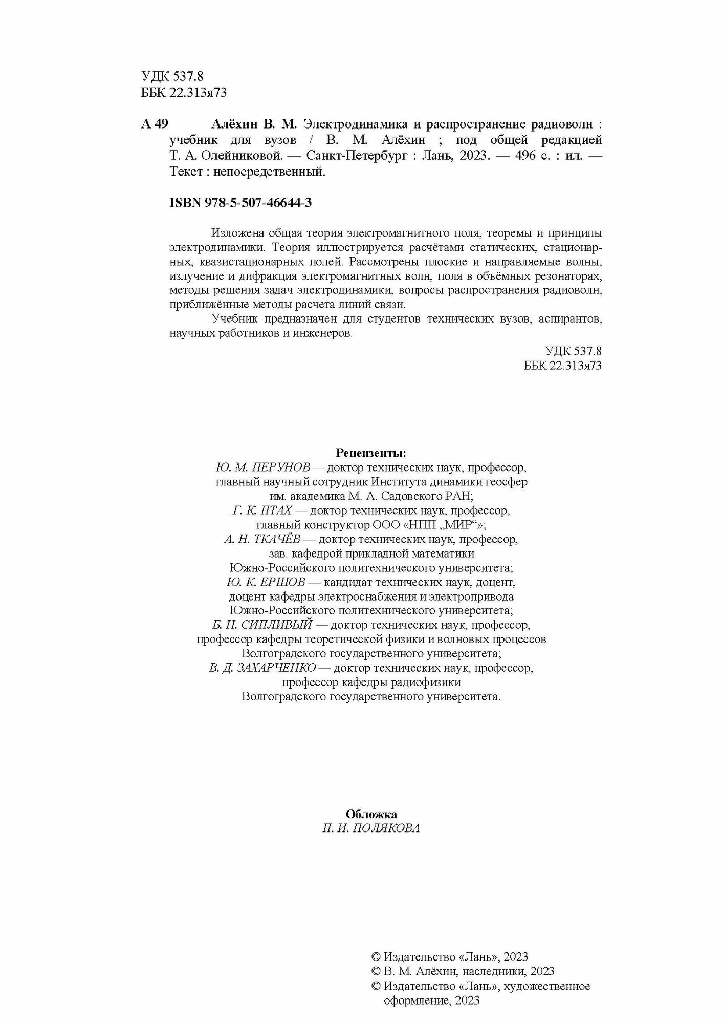 Электродинамика и распространение радиоволн. Учебник (В. М. Алёхин); Издательство ЛАНЬ, 2023