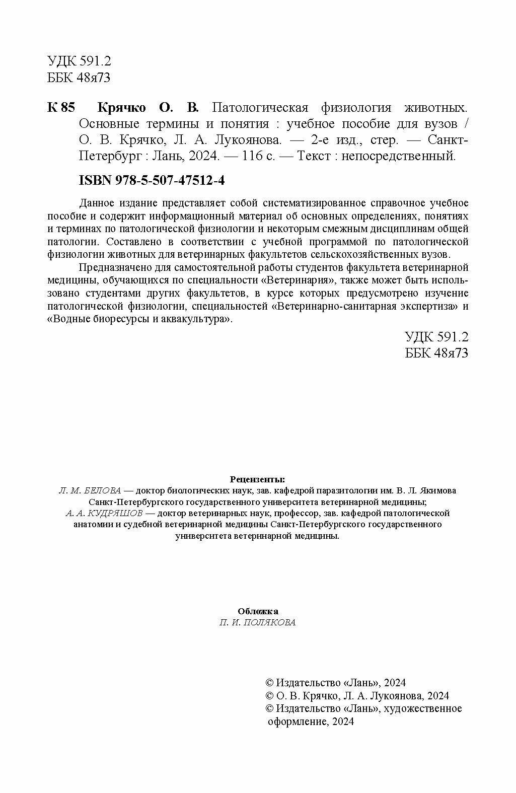Патологическая физиология животных. Основные термины и понятия. Учебное пособие (Крячко Оксана Васильевна, Лукоянова Любовь Александровна); Лань, 2023