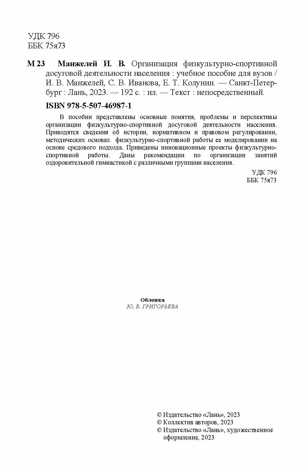 Организация физкультурно-спортивной досуговой деятельности населения. Учебное пособие (Манжелей Ирина Владимировна, Иванова Светлана Владимировна, Колунин Евгений Тимофеевич); Лань, 2023