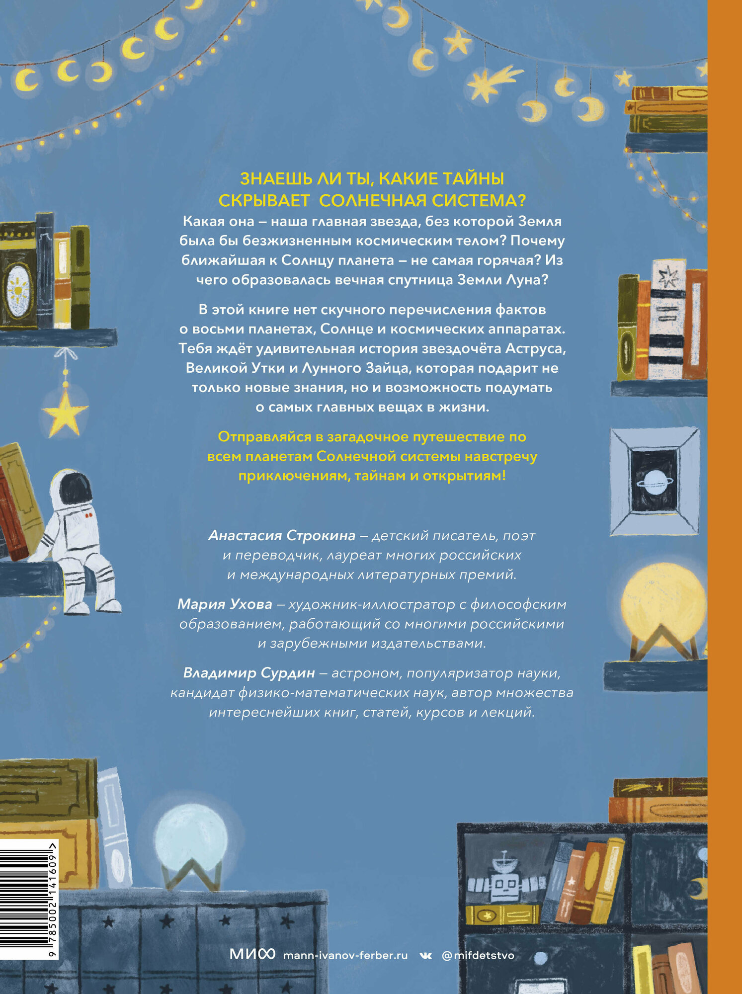 Новая книга от автора и иллюстратора "Атласа загадочных мест России". На небольшом острове живет небесный наблюдатель Аструс. Однажды в его жизни произошла невероятная встреча с Великой Уткой и Лунным Зайцем. С тех пор он хранит свою тайну, смотрит на небо в телескоп, изучает планеты и звезды и знает о них чуточку больше, чем любой астроном на Земле… Волшебная, сказочная история, которая заставит задуматься о самом главном в жизни. Проверенные научные факты о нашем доме — Солнечной системе. Фишки книги — Научные факты вплетены в потрясающую художественную историю, и все вместе это дает не просто новые знания о мире, но и мысли, переживания, чувства, надежды и важные выводы. А заодно и приучает ребенка к хорошей литературе. — От автора "Атласа загадочных мест России", лауреата многочисленных премий. — Все факты проверены научным редактором, астрономом, лауреатом премии "Просветитель" и популяризатором науки Владимиром Сурдиным. — Если нужно кратко узнать особенности того или иного космического тела в Солнечной системе, то достаточно открыть книгу на нужной странице и заглянуть в карточку. Но для получения полного удовольствия рекомендуем читать книгу от начала и до конца. Для кого эта книга Для детей от 7 лет. Для всех влюбленных в космос.