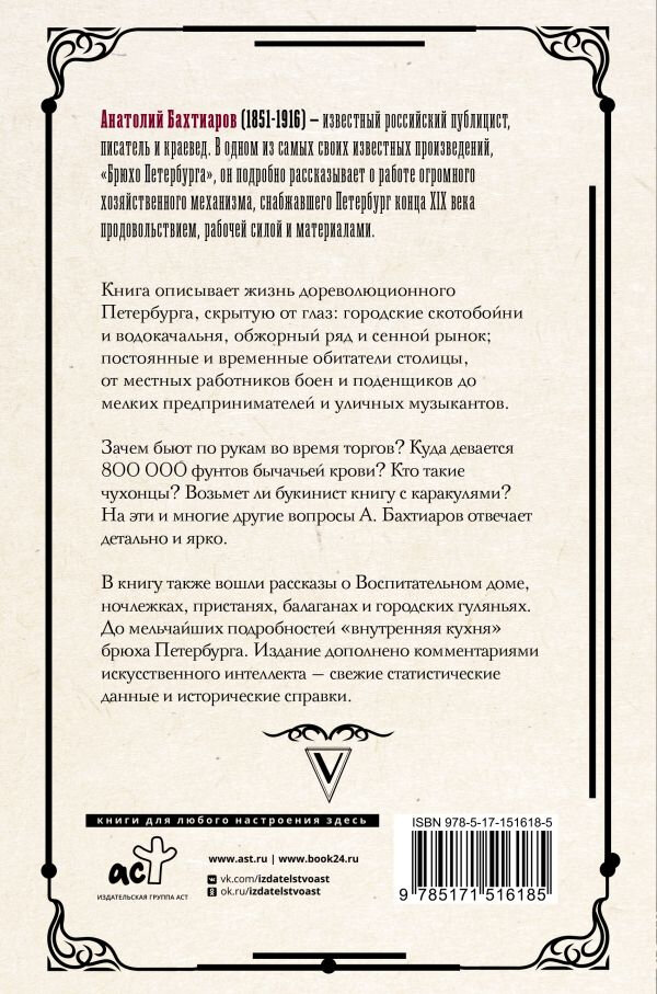 Анатолий Бахтиаров (1851-1916) — известный российский публицист, писатель и краевед. В одном из самых своих известных произведений, «Брюхо Петербурга», он подробно рассказывает о работе огромного хозяйственного механизма, снабжавшего Петербург конца XIX века продовольствием, рабочей силой и материалами.Книга описывает жизнь дореволюционного Петербурга, скрытую от глаз: городские скотобойни и водокачальня, обжорный ряд и сенной рынок; постоянные и временные обитатели столицы, от местных работников боен и поденщиков до мелких предпринимателей и уличных музыкантов.Зачем бьют по рукам во время торгов? Куда девается 800 000 фунтов бычачьей крови? Кто такие чухонцы? Возьмет ли букинист книгу с каракулями?На эти и многие другие вопросы А. Бахтиаров отвечает детально и ярко. В книгу также вошли рассказы о Воспитательном доме, ночлежках, пристанях, балаганах и городских гуляньях. До мельчайших подробностей «внутренняя кухня» брюха Петербурга. Издание дополнено комментариями искусственного интеллекта — свежие статистические данные и исторические справки.