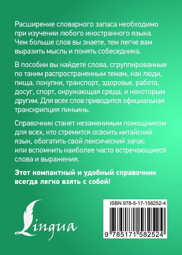 В этом пособии вы сможете найти распространенные слова и выражения, сгруппированные по нескольким темам: люди, тело, здоровье, обучение, работа, торговля, одежда, пища, инфраструктура, транспорт, отдых, спорт, мир, город. Ко всем словам приводится официальная транскрипция пиньин.Словарь подойдет всем, кто начинает учить китайский язык и стремится пополнить лексический запас или вспомнить часто встречающиеся слова и выражения.