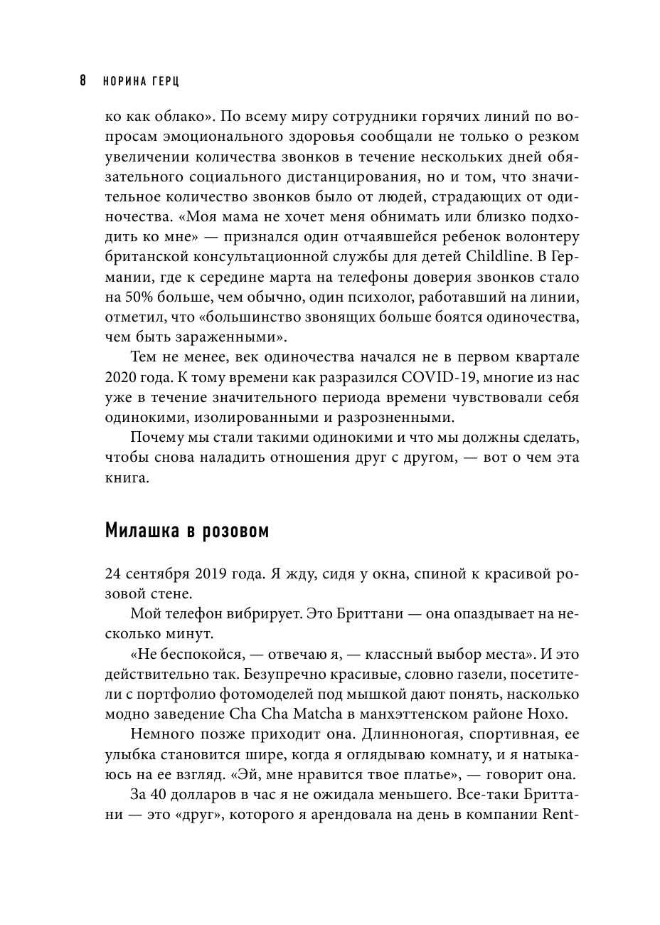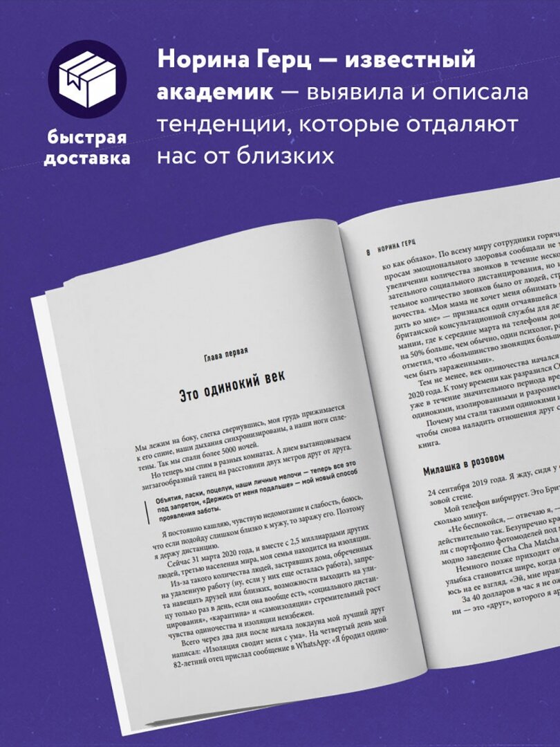 Одиночество вредит нашему здоровью, так же как курение пятнадцати сигарет в день. Пандемия заставила нас осознать, что может сделать с нами одиночество, но это не начало, а тревожный звонок. Причины сегодняшнего кризиса одиночества многочисленны и разнообразны, и автор углубляется в каждую из них, чтобы помочь нам осознать их важность. Известные академик Норина Герц исследует тенденции, которые отдаляют нас от наших ближних и близких: - Темп современной городской жизни. - Бесконтактный шопинг. - Зависимость от экранов, особенно наших мобильных телефонов. - Тенденции в рабочей среде. - Гиг-экономика и разновидности фриланса. - Автоматизированные помощники, роботы и секс-игрушки. - Быстрый упадок района, магазины и социальные клубы. Норина Герц цитирует большое количество исследований, примеров из реальной жизни, интервью и событий, чтобы убедить нас в настоящем состоянии мира. «Поколение одиночек» предлагает обнадеживающее и вдохновляющее видение того, как исцелить наши разрушенные общины и восстановить связь в нашей жизни.
