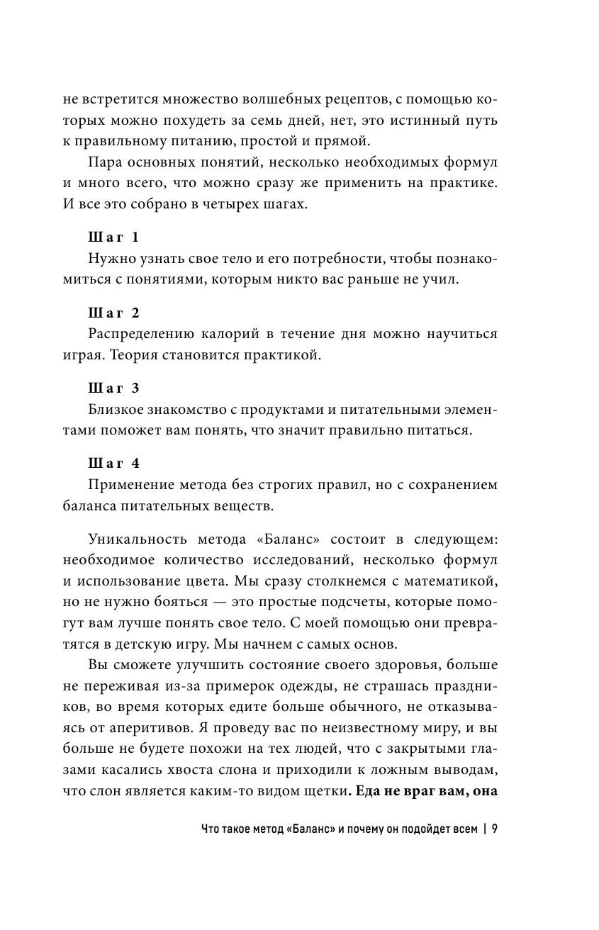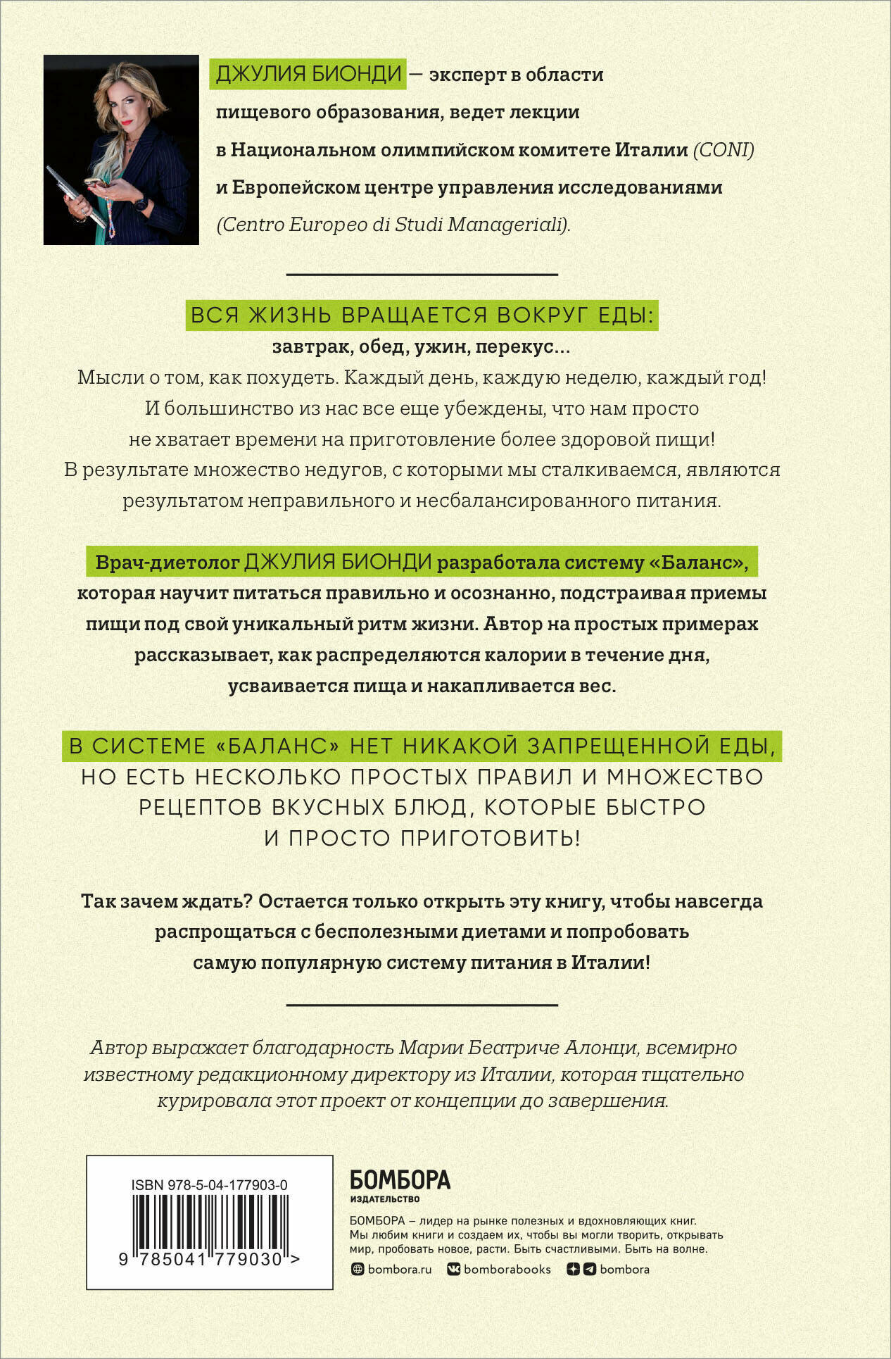 Специалист по питанию Джулия Бьонди разработала авторский метод «Баланс», который научит питаться правильно и осознанно, подстраивая приемы пищи под свой уникальный стиль жизни. Беседуя с читателем как с близким другом, автор на простых примерах расскажет, как распределяются калории в течение дня, усваивается пища и накапливается вес. Поняв этот процесс, вы сможете грамотно выстроить питание под себя, сохранив его богатство и разнообразие.