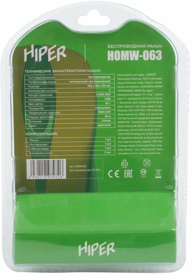 Беспроводная мышь Hiper HOMW-063 оптического типа весит 53 г и функционирует от двух батареек ААА, которые идут в комплекте вместе с приемным блоком. Устройство отличается эргономичным дизайном и легко ложится в руку. Сверху располагается колесико прокрутки. Специальное покрытие верхней части предотвращает проскальзывание. Радиус действия модели 10 м обеспечивает свободу движений. Связь с компьютером осуществляется через разъем USB 2.0.