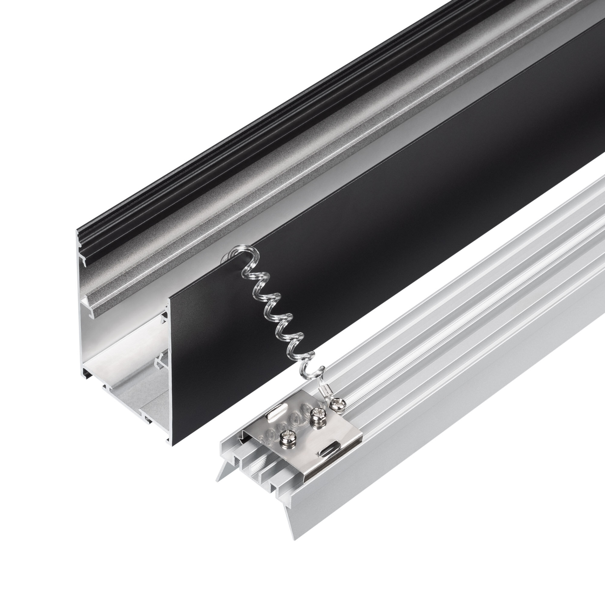 Подвесной/накладной профиль черного цвета из алюминия для основного освещения и контурной подсветки. Возможность установки антибликовой решетки Honeycomb поверх экрана позволяет получить более комфортное для глаз освещение.