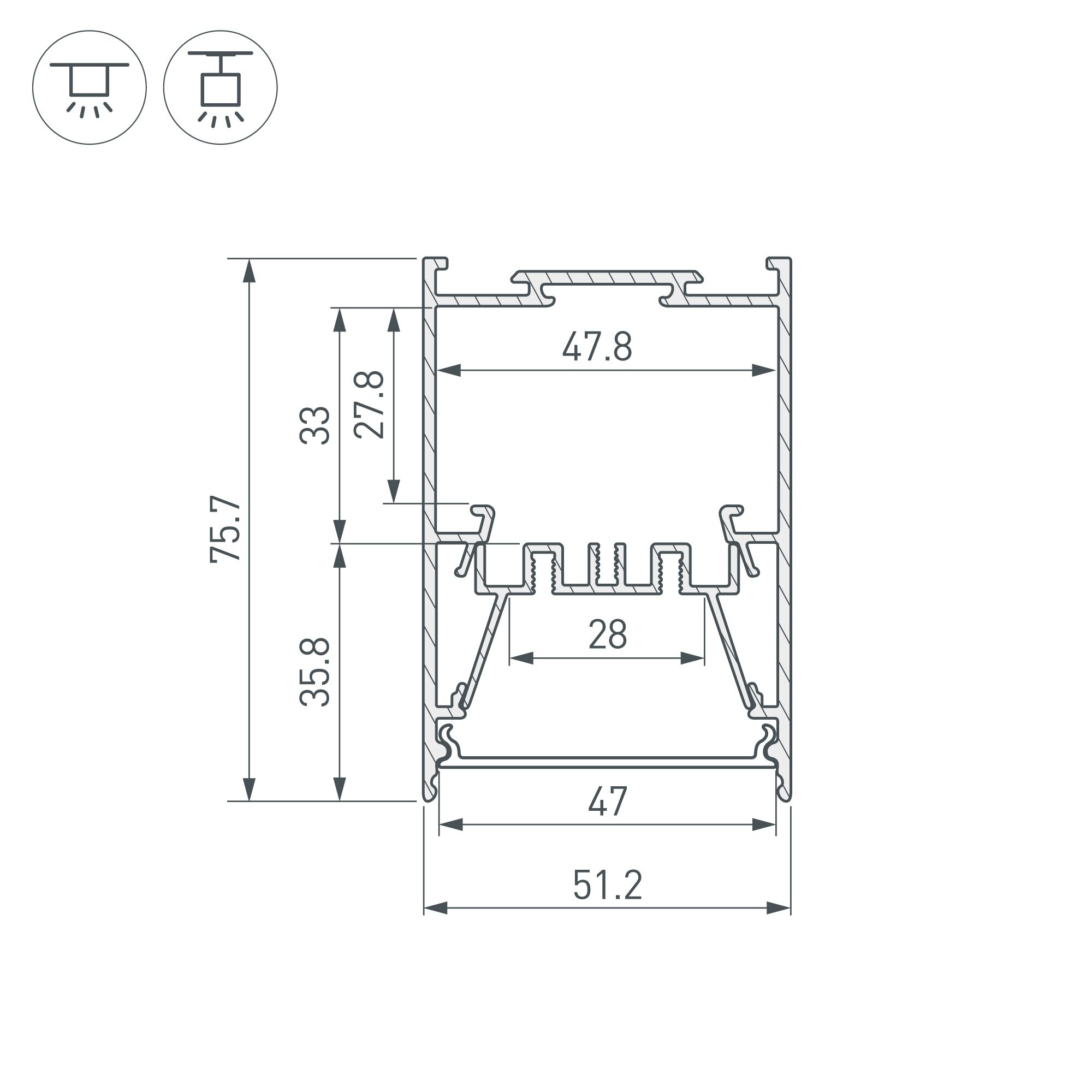 Отсек для блока питания (47,8х27,8 мм) и съемная площадка для светодиодной ленты значительно облегчают сервисное обслуживание осветительного оборудования. Габаритные размеры профиля составляют 2000 мм в длину, 75,7 мм в ширину и 51,2 мм в высоту. Площадки для установки светодиодных лент позволяют использовать ленты шириной до 28 мм и мощностью до 46 Вт/м. Это обеспечивает гибкость в выборе светодиодных лент и создает потрясающие световые решения.