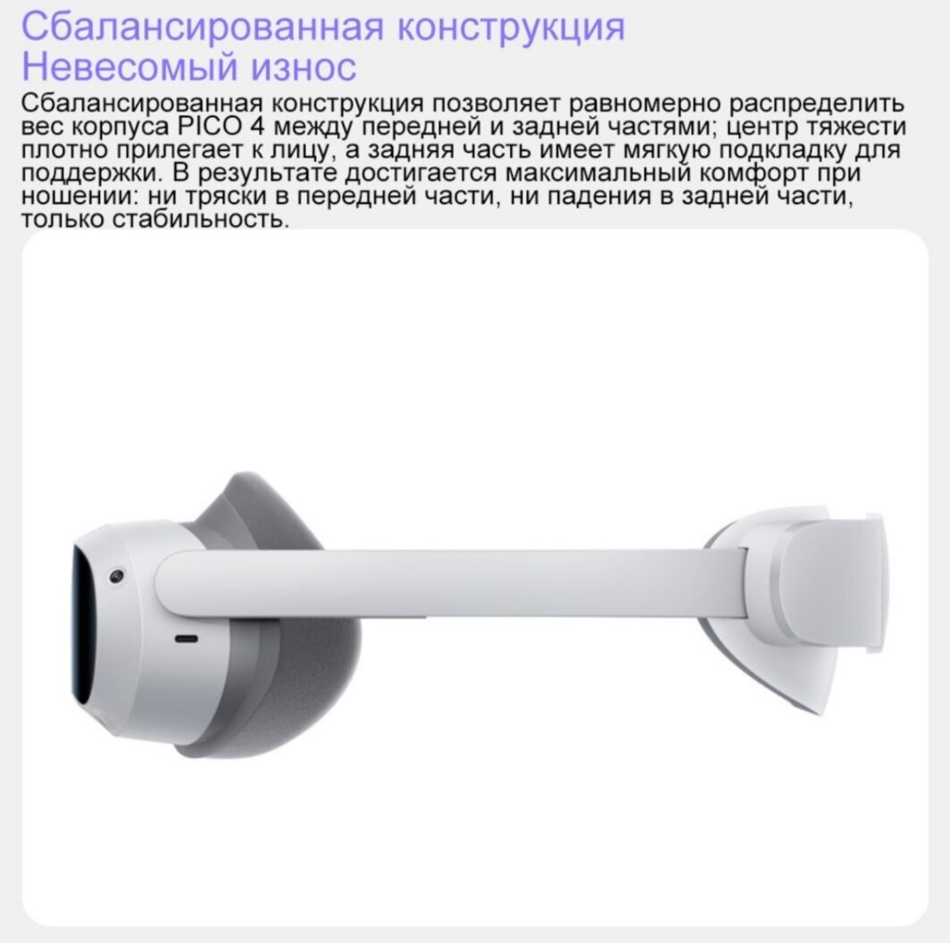 Pico 4 – первый потребительский автономный VR шлем с ультратонкой оптикой, отслеживанием рук, цветным режимом смешанной реальности и массой других современных функций. Гарнитуру можно использовать для игр и работы в беспроводном режиме, а также с подключением к компьютеру. Самый легкий VR-шлем 2022 года Pico 4 VR легче бестселлера Oculus Quest 2 почти в два раза, благодаря новой технологии дисплея. Шлем предлагает разрешение 4K+ – 2160x2160 на один глаз с плотностью пикселей 1200 PPI. Частота обновления поддерживает 90 Герц. Угол обзора увеличен до 105 градусов. Не мечтайте, а воплощайте Окунитесь в мир игр виртуальной реальности – ежемесячно в Pico Store выходят крутые бестселлеры игровой индустрии. Теперь погружение будет в разы дольше и эргономичнее: родное крепление пластиковое и имеет сбалансированную массу. Вы можете настроить посадку шлема с помощью колеса на затылке и верхнего ремешка. Сзади расположен аккумулятор на 5300 мАч, которые распределяет вес гарнитуры. Совмещайте реальную реальность с виртуальной Pico 4 оснащен 15МП камерой смешанной реальности, которая отображает реальный мир в высоком качестве и RGB-цветах. Прикоснитесь к VR кончиками пальцев Впервые в Pico 4 встроено отслеживание рук. Без модулей, датчиков и других дополнительных устройств. Звук – это важно В дужки встроены динамики Super Linear Speakers. Они работают в широком частотном диапазоне, обеспечивая пространственный звук, качественные басы, впечатляющие высокие и средние частоты. Настройка – не проблема Pico 4 работает на абсолютно новой, переработанной операционной системе Pico OS 5.0. Пользовательский интерфейс стал user-friendly и включает новые функции, такие как многозадачность, фитнес, управление библиотекой приложений, управление списком друзей и т. д. Лучшие взаимодействия Контроллеры Pico 4 претерпели полный ребрендинг: кольца с датчиками расположены над внешней стороной ладони, что позволит сближать руки и не переживать о поломке. Присутствуют все необходимые для игр элементы управления: триггеры, курки, джойстики, AB/XY и системное меню. Контроллеры покрыты текстурированным пластиком. Вибромотор HyperSense работает на частотах от 50 до 500 Гц и обеспечивает супер-точную тактильную обратную связь. Создайте свою копию в VR-мире Новая система аватаров позволит создать максимально точный аватар для метавселенной и социальных сетей. Pico сообщили о партнерстве с производителями аватаров и известными NFT-художниками. Делитесь впечатлениями с друзьями Транслируйте изображение с Pico 4 на телевизор, ПК, браузер или смартфоны в пару кликов. Одна из интересных особенностей нового VR-шлема – удаленный помощник. Вы можете подсказать играющему другу и направить его, создав точку-подсказку на смартфоне.