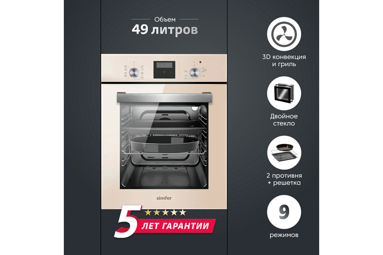 На сегодняшний день товар «Электрический духовой шкаф Simfer B4EG59070 (9 режимов работы гриль таймер турбо-конвекция серое стекло)» можно купить с кешбеком в 1 магазине: Яндекс.Маркет