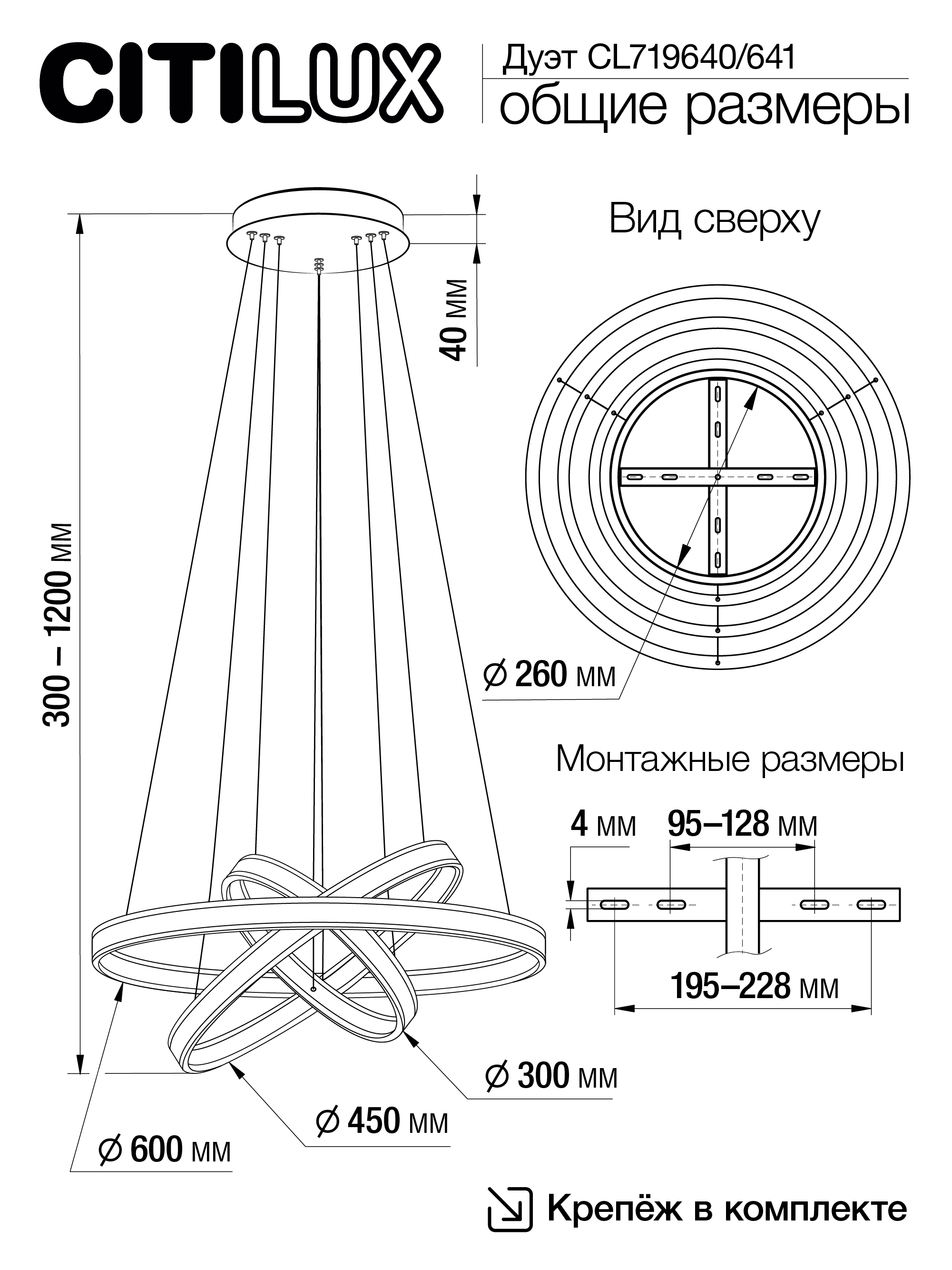 С помощью пульта доступно: плавная регулировка яркости от 10 до 100%; управление цветовой температурой от 3000К до 5500К, позволяет настроить любые оттенки теплого, нейтрального и холодного света. Есть функция отсроченного выключения, 4 настраиваемых режима памяти, которыми также можно управлять настенным выключателем. Пульт ДУ в комплекте, тип батареек ААА (батарейки в комплект не входят, приобретаются отдельно). Мощность 108Вт, диаметр 60см, высота легко регулируется от 17см до 1,2м. Крепление подходит для всех типов потолков, в том числе натяжных, тип крепления – планка.