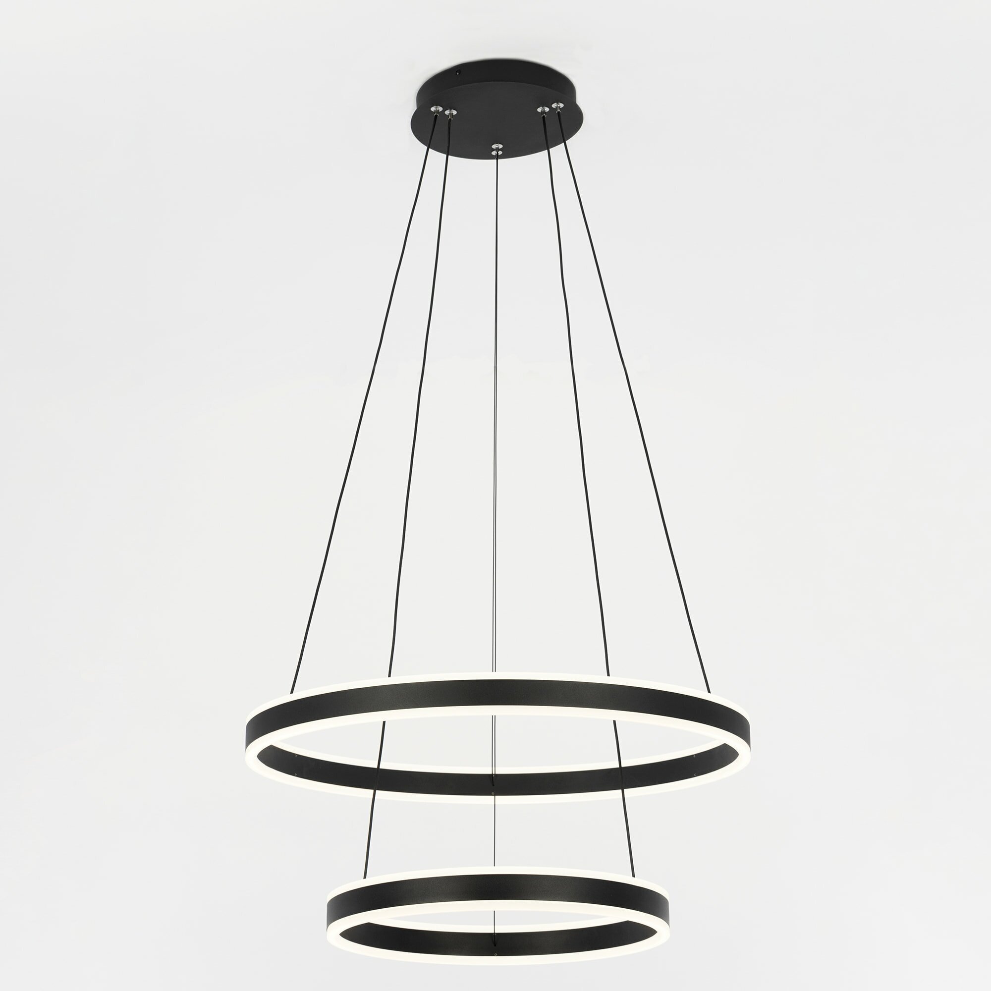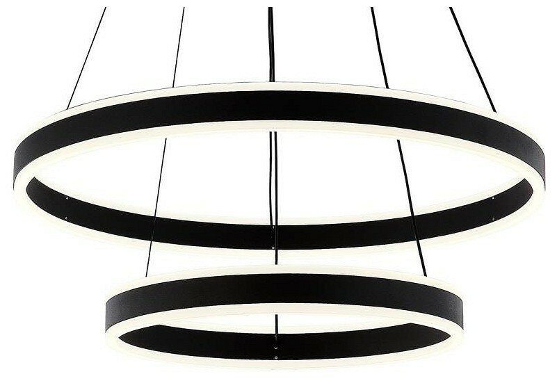 Светодиодная люстра Citilux Дуэт CL719641 выполнена в современном стиле. Чёрная люстра на тросах с двумя подвесными кольцами, высоту и угол наклона каждого из которых можно легко изменить. Кольца - светодиодные модули изготовлены из алюминиевого профиля, рассеиватель из оптического полимера. Наличие источников света с двух сторон профиля позволяет равномерно осветить всё помещение.