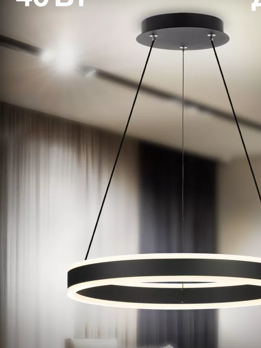 Светильник оснащён встроенным ступенчатым диммером, три уровня яркости – 100-40-15%, управляется обычным настенным выключателем. Мощность изделия 40Вт, цветовая температура 4000К (нейтральный белый свет), диаметр 40см, высота легко регулируется от 20см до 1,2м. Крепление подходит для всех типов потолков, в том числе натяжных, тип крепления – планка.