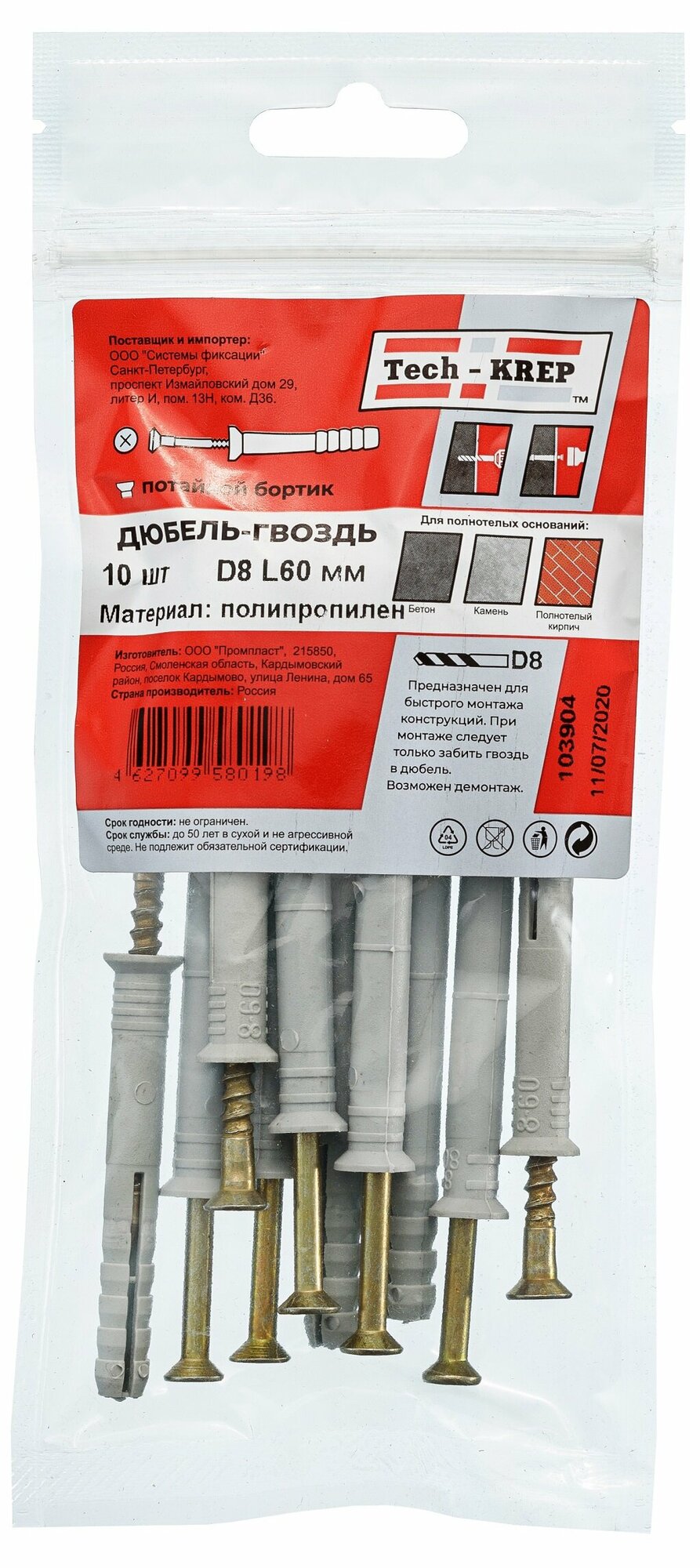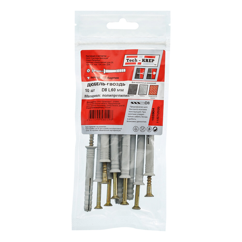 Дюбель-гвоздь Tech-Krep 8х60 потайная манжета 10 шт в пакете
