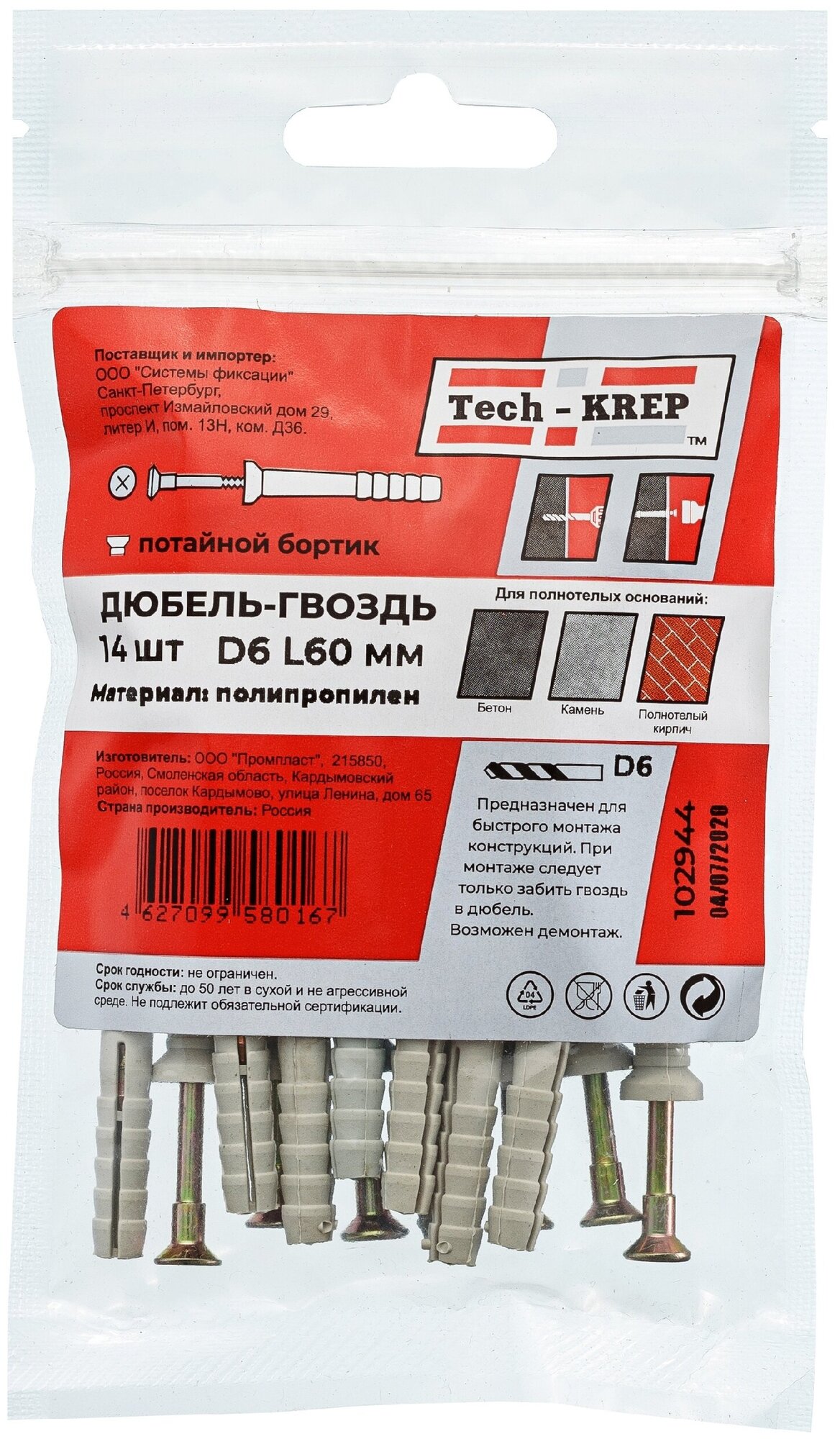Дюбель-гвоздь Tech-Krep 6х60 потайная манжета 14 шт в пакете