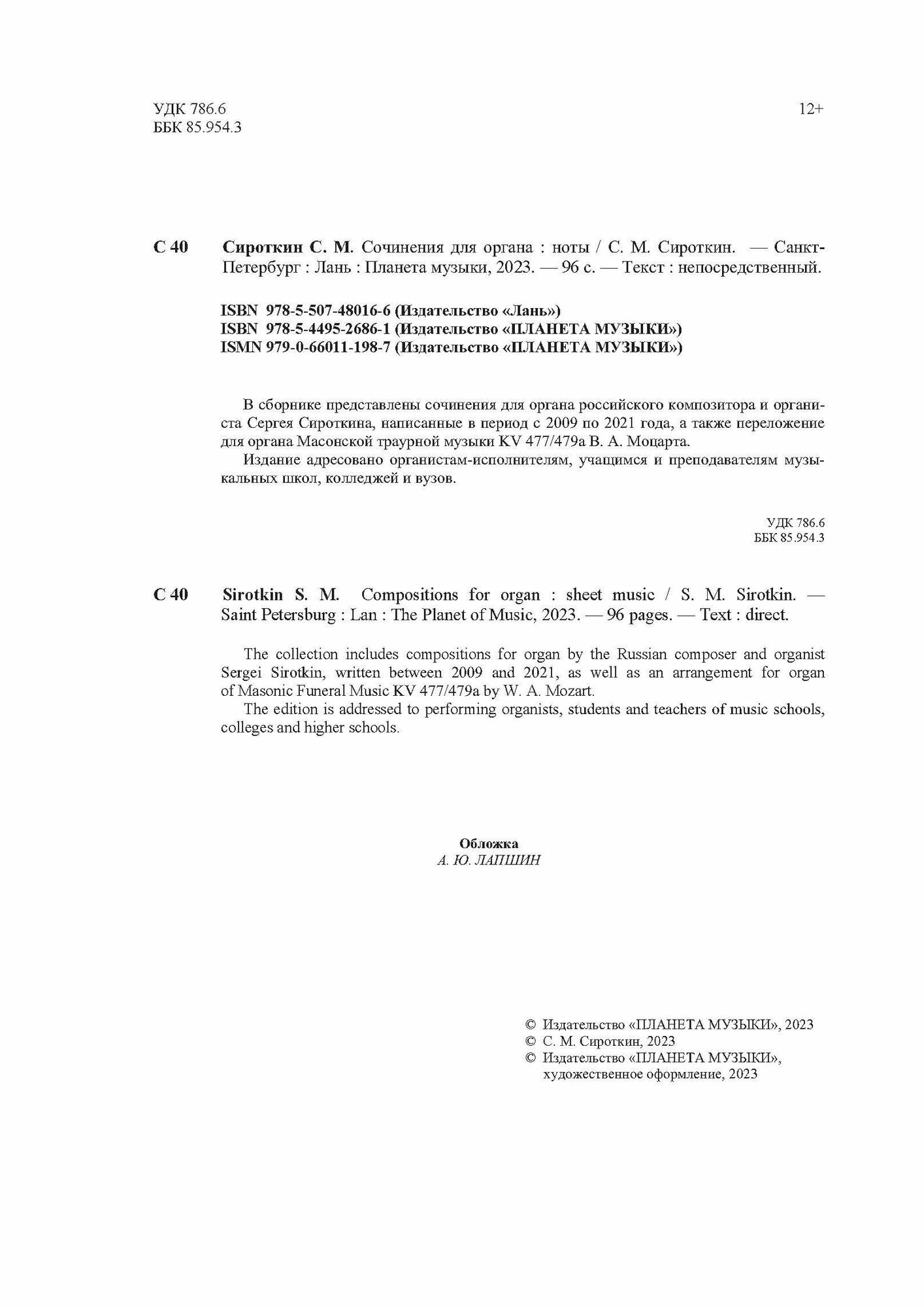 Сочинения для органа. Ноты (С. М. Сироткин); Издательство «Планета музыки», 2024