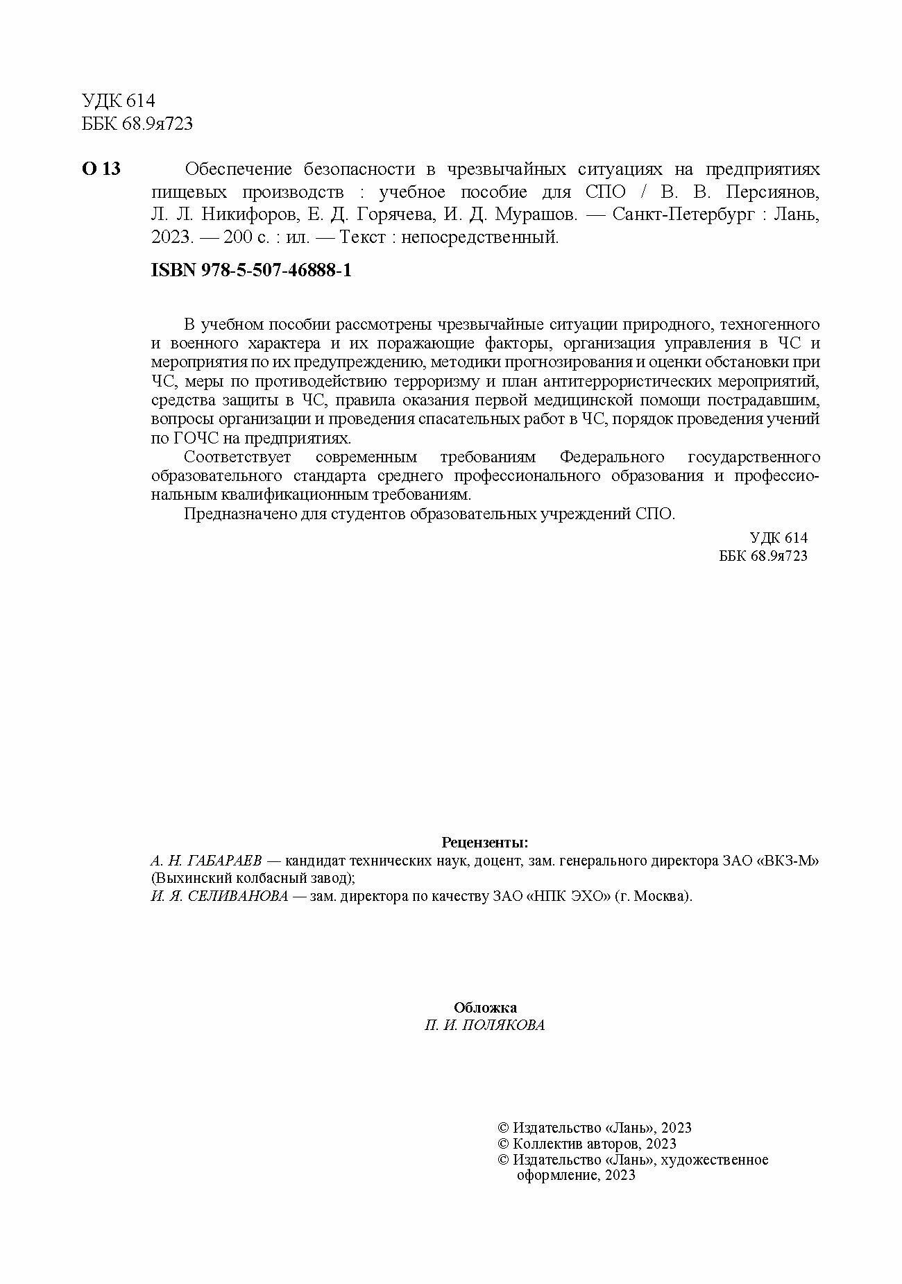 Обеспечение безопасности в чрезвычайных ситуациях на предприятиях пищевых производств (Персиянов Валерий Владимирович, Никифоров Леонид Львович, Мурашов Игорь Дмитриевич); Лань, 2023
