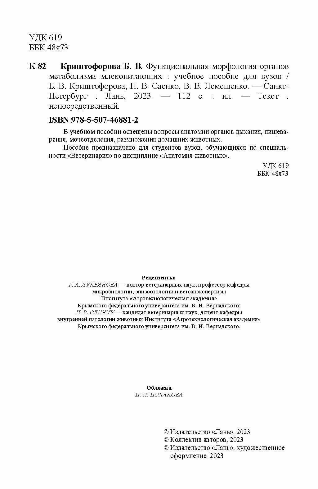 Функциональная морфология органов метаболизма млекопитающих (Б. В. Криштофорова); Издательство ЛАНЬ, 2023