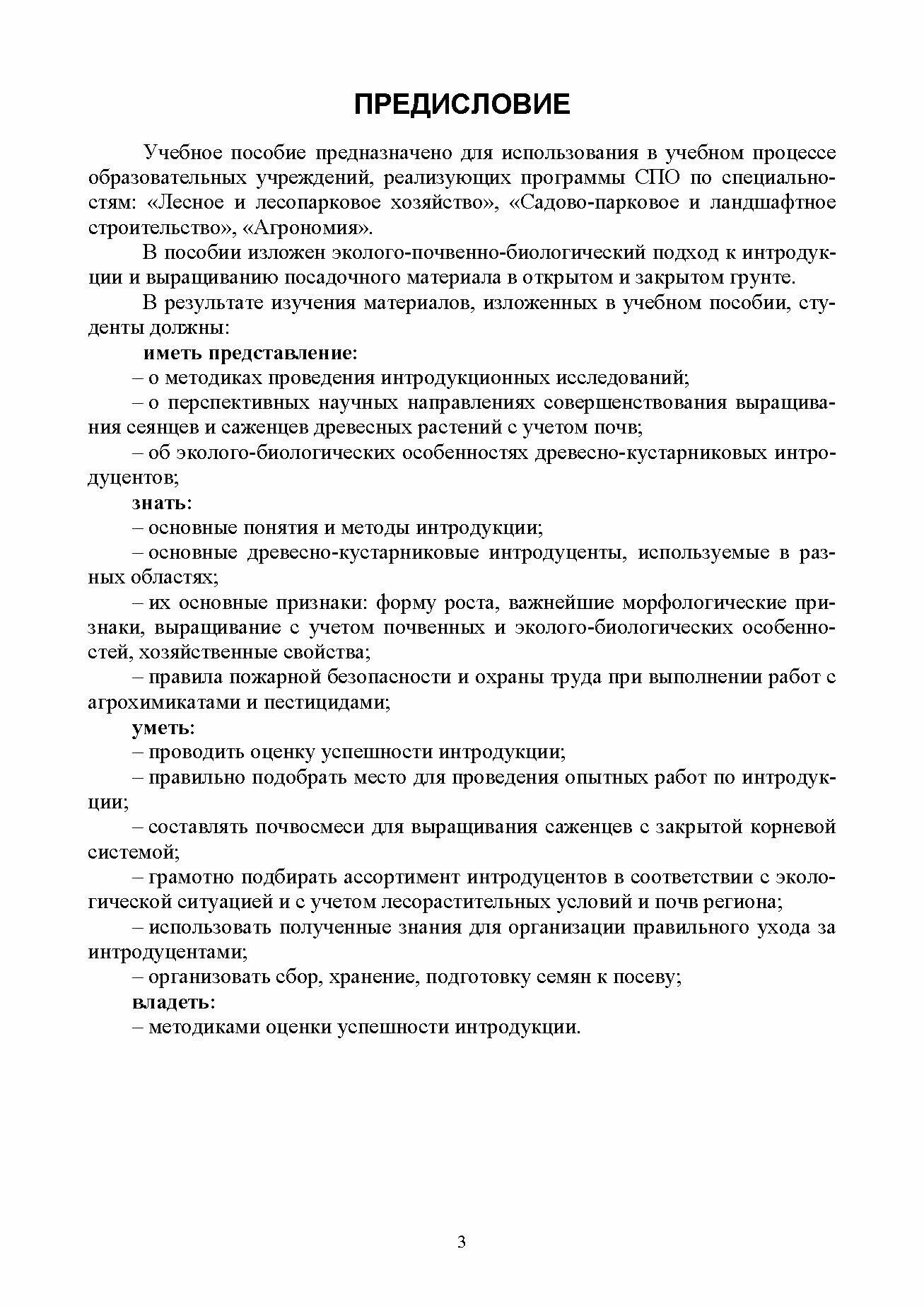 В учебном пособии описаны эколого-биологические и почвенные условия интродукции некоторых древесно-кустарниковых пород. Особое внимание уделено методикам, применяемым при интродукции. Приведены данные углубленного исследования почв, являющиеся основой интродукции растений по современным технологиям. Проведена оценка успешности интродукции лекарственных, витаминных и улучшающих среду обитания растений.
