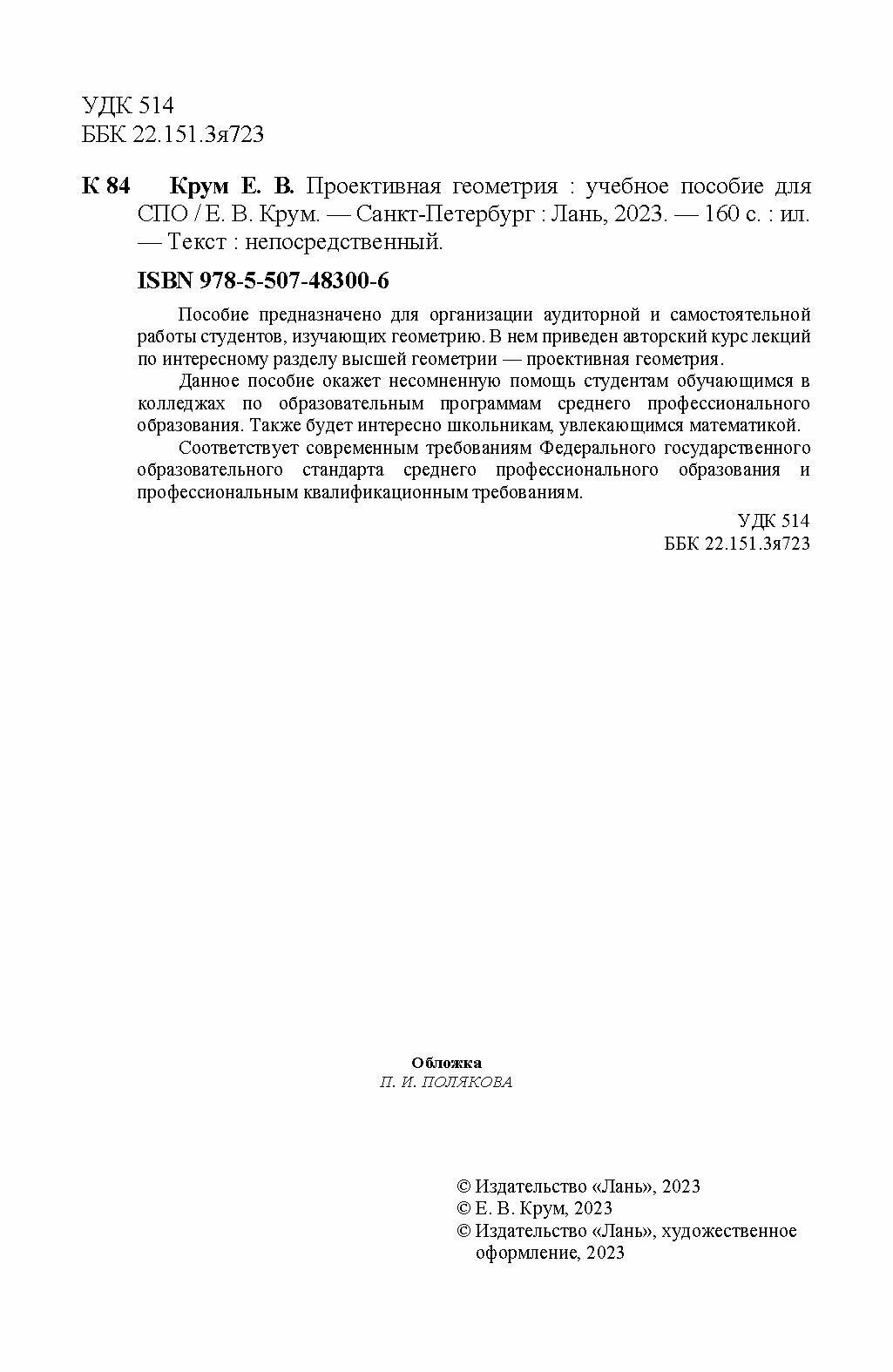 Проективная геометрия. СПО (Е. В. Крум); Издательство ЛАНЬ, 2023