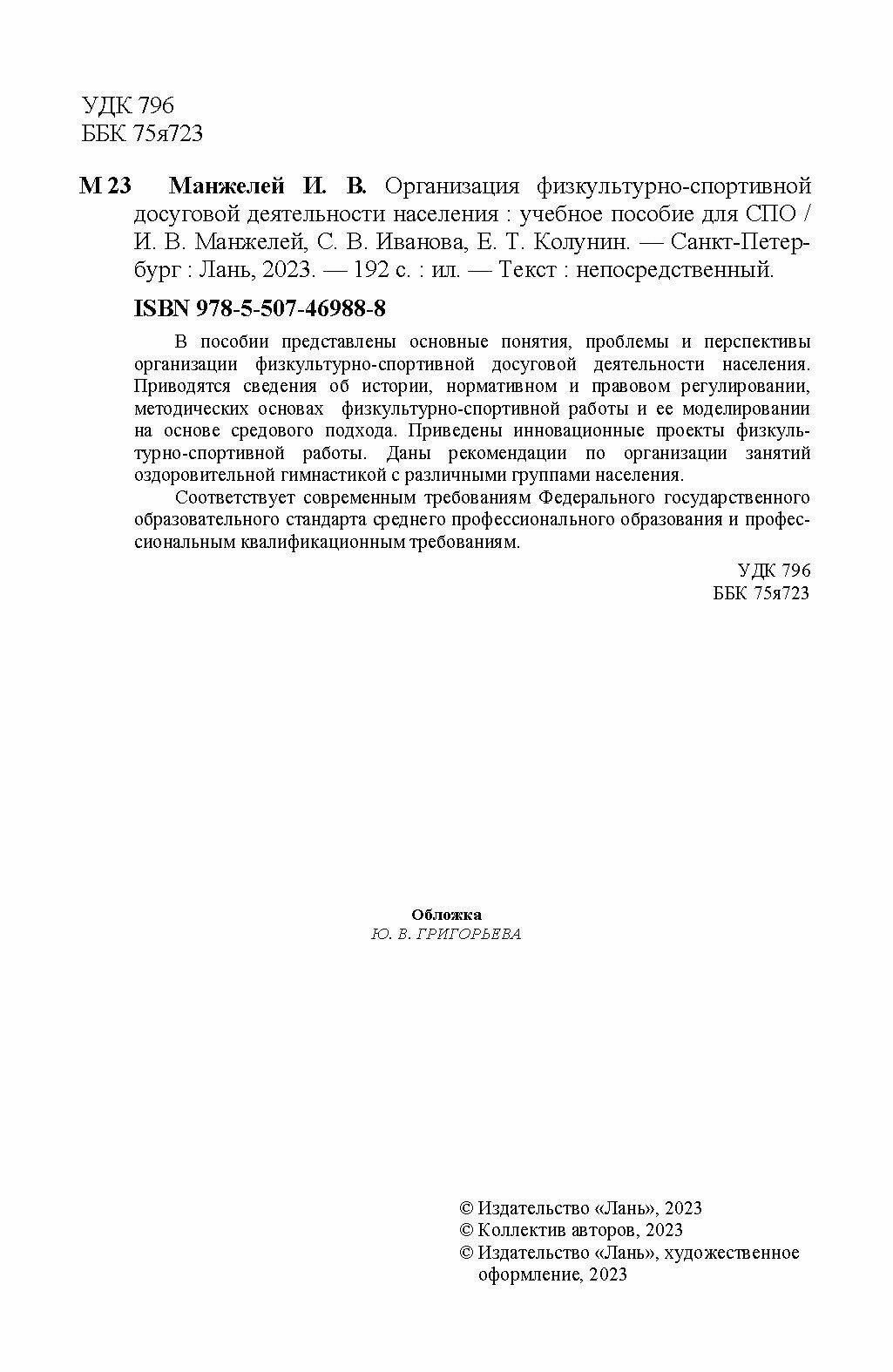 Организация физкультурно-спортивной досуговой деятельности населения. СПО (Манжелей Ирина Владимировна, Иванова Светлана Владимировна, Колунин Евгений Тимофеевич); Лань, 2023