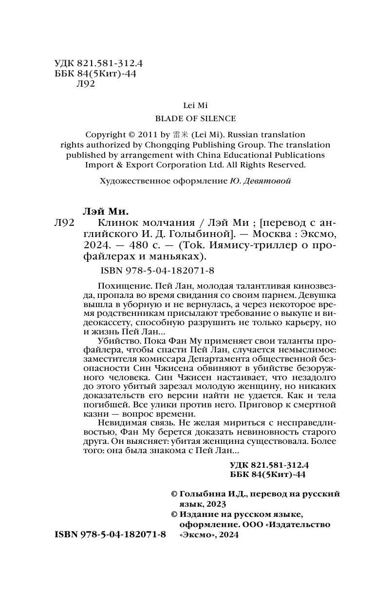 Книга: Клинок молчания (Лэй Ми); Эксмо, Inspiria, Редакция 1, 2024