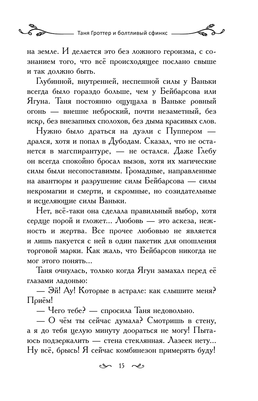 Сфинксы бывают разные. Египетские, ассирийские, греческие. Но среди них только один любит заключать магические сделки. Однажды, в недобрый час, когда нежить почти захватила Тибидохс, именно ему Древнир пообещал ключ от Жутких Ворот в обмен на победу. Правда, сфинкс посулил несколько сотен лет отсрочки. И вот они миновали... Но далеко не все, что ты отдал однажды, можно взять назад. Глеб Бейбарсов понимает - отказавшись от Тани, он поспешил. Однако теперь на пути у него стоит Ванька. Глеб не может расправиться с соперником сам, и потому выбирает необычную дуэль. Но от этого поединок не становится менее опасным, особенно если на бамбуковую тросточку Бейбарсова насажен обломок старой косы Аиды Плаховны..