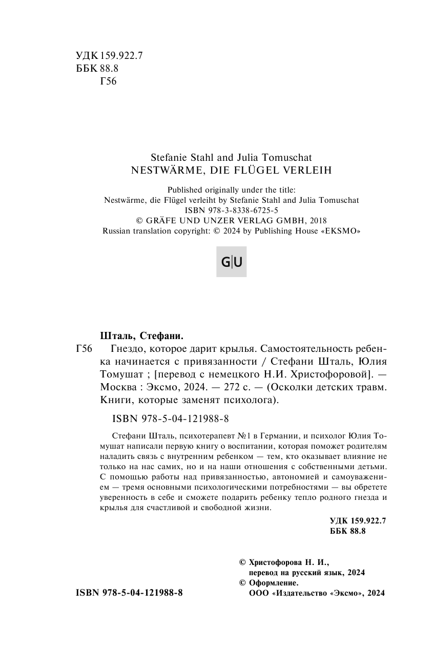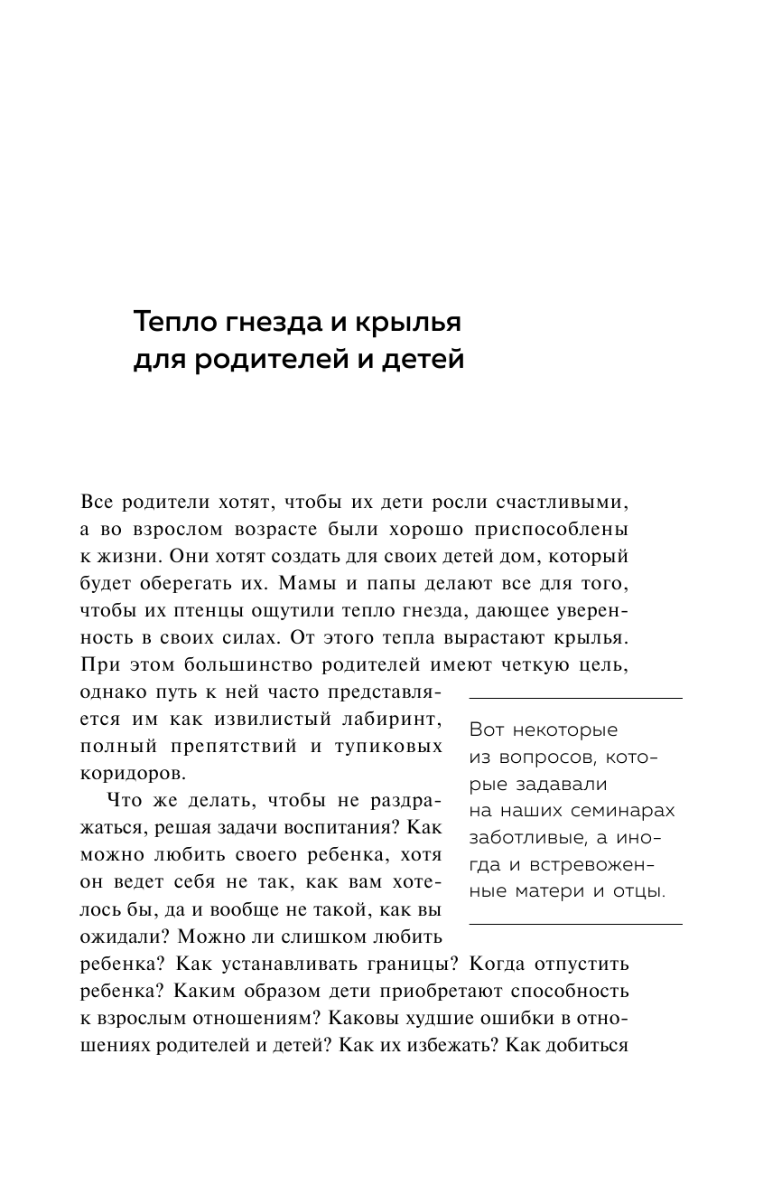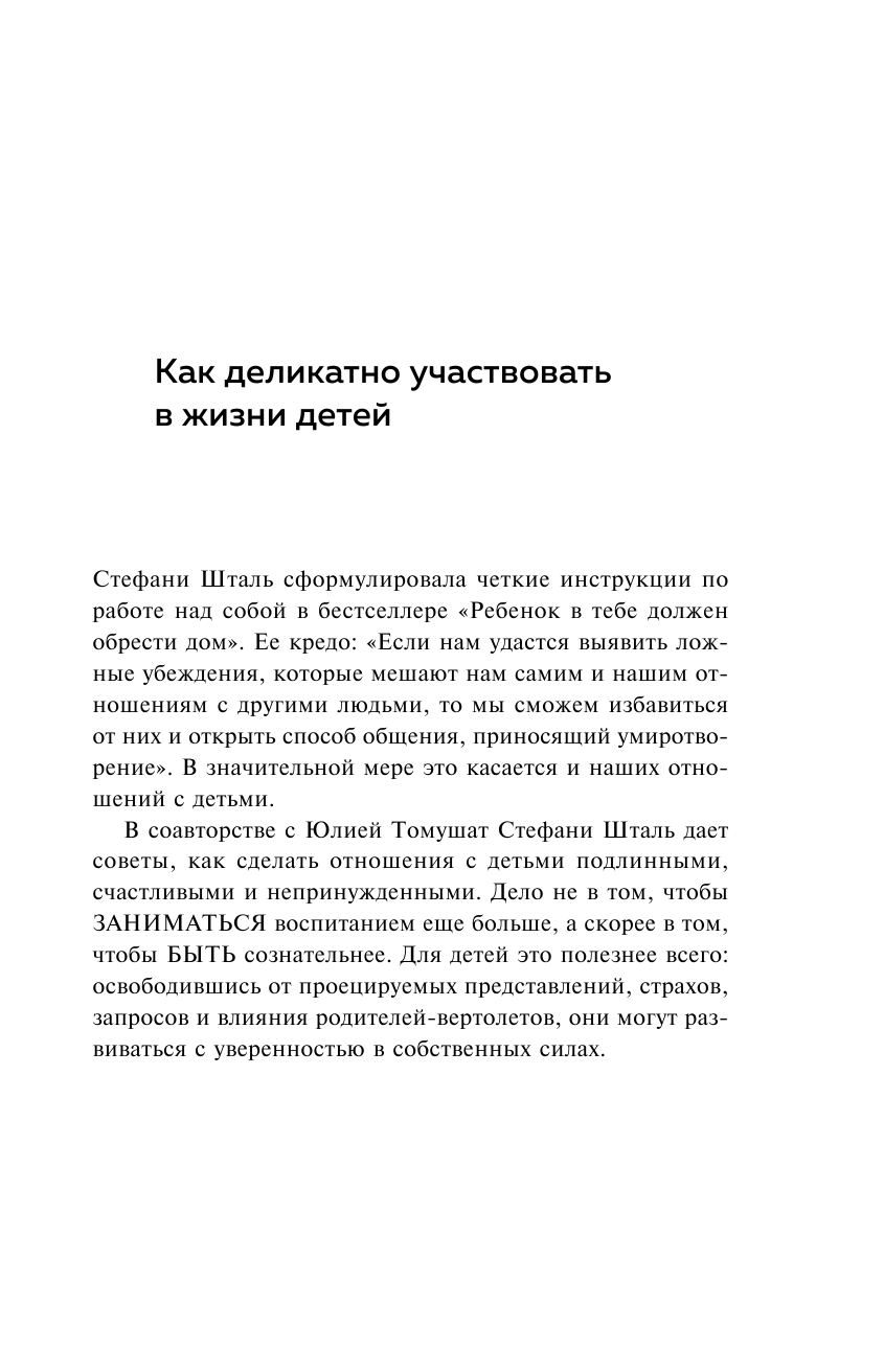 Стефани Шталь, психотерапевт №1 в Германии, и психолог Юлия Томушат, написали первую книгу о воспитании, которая поможет родителям наладить связь с внутренним ребенком, —тем, кто оказывает влияние не только на нас самих, но и на наши отношения с собственными детьми. С помощью работы над привязанностью, автономией и самоуважением — тремя основными психологическими потребностями, вы обретете уверенность в себе и сможете подарить ребенку тепло родного гнезда и крылья для счастливой и свободной жизни.