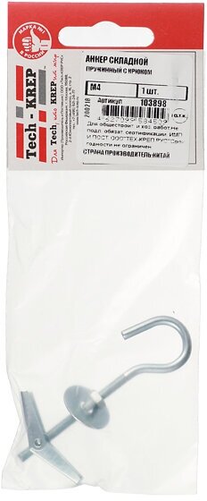 Складной пружинный дюбель с крюком М4 1 штука Стройбат