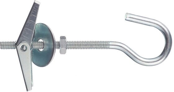Дюбель складной пружинный с крюком используют для крепления различных светильников, элементов стеллажей, карнизов для штор и навесных шкафов, кабельных лотков и т.п.