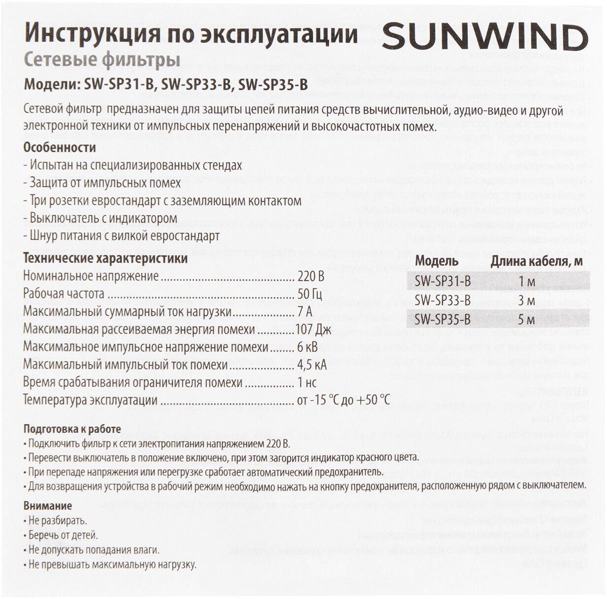 Сетевой фильтр SunWind SW-SP35-B — устройство, которое обеспечивает защиту приборов от резких перепадов напряжения в электросети. Предназначено для единовременного подключения аппаратуры с невысокой мощностью потребления. Особенности Конструкция представлена тремя розетками типа EURO, что позволяет подключать бытовые приборы и офисную технику любых производителей.Номинальное напряжение питающей сети 220 В — для подключения любого типа электроприборов.Способен выдерживать нагрузки мощностью до 1500 Вт и ток нагрузки до 7 A.Максимальная рассеиваемая энергия 107 Дж позволяет использовать фильтр в быту и офисах.Длины шнура в 5 м достаточно для подключения приборов в любом месте помещения.Подавление импульсных помех предотвращает выход техники из строя при резких перепадах напряжения. Универсальность и безопасность Сетевой фильтр предназначен для активной эксплуатации внутри помещений. Возможно подключение гаджетов, бытовой техники или электроинструментов. Заземление обеспечивает высокий уровень безопасности. Конструкцией предусмотрена клавиша-выключатель для быстрого обесточивания всех подключенных устройств. Также есть защита от перегрева и короткого замыкания. Корпус изготовлен из прочного огнеупорного пластика.