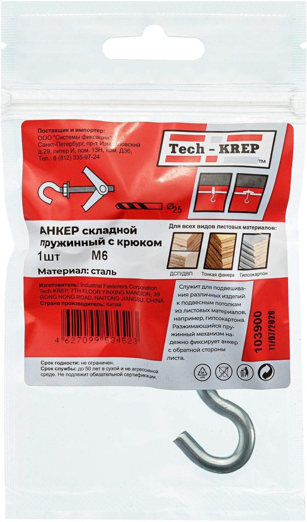 Складной пружинный дюбель с крюком М6 1 штука Стройбат