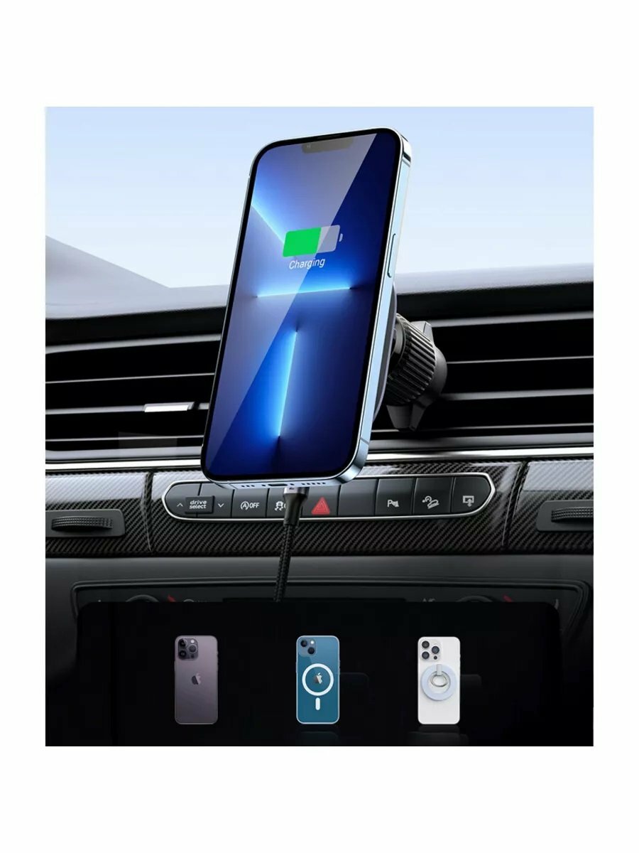 Практичный автомобильный держатель с индукционным зарядным устройством. Это позволяет вам удобно пользоваться навигацией и держать свой смартфон под рукой, одновременно заряжая его! Входящие в комплект аксессуары позволяют удобно закрепить изделие в любом месте - на приборной панели, на решетке радиатора или на лобовом стекле.