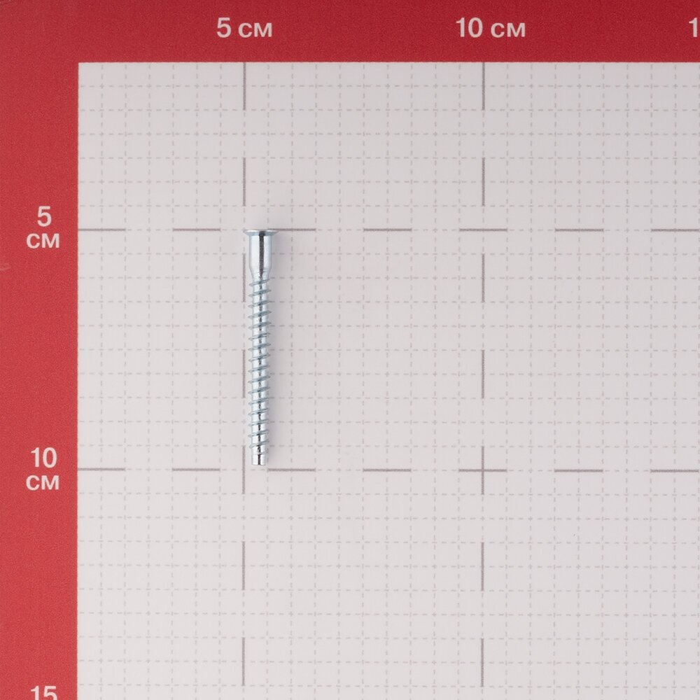 Стяжка шурупная применяется при производстве мебели для соединения листов ДСП под углом 90 градусов с обязательным предварительным сверлением. Плоская потайная головка шурупа-стяжки после установки может быть закрыта декоративной пластмассовой заглушкой.