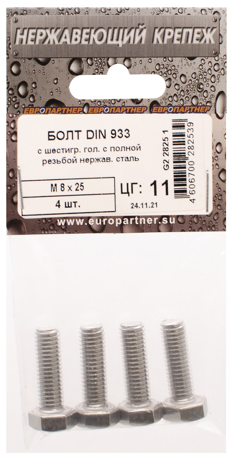 Болт DIN 933 с шестигранной головкой с полной резбой 8 х 25 4 штуки Европартнер