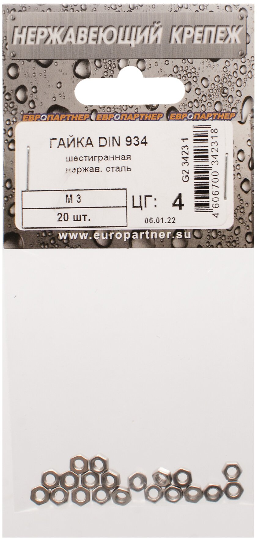 Гайка шестигранная DIN 934 М3 20 штук Европартнер М3 DIN934 (20 шт.)