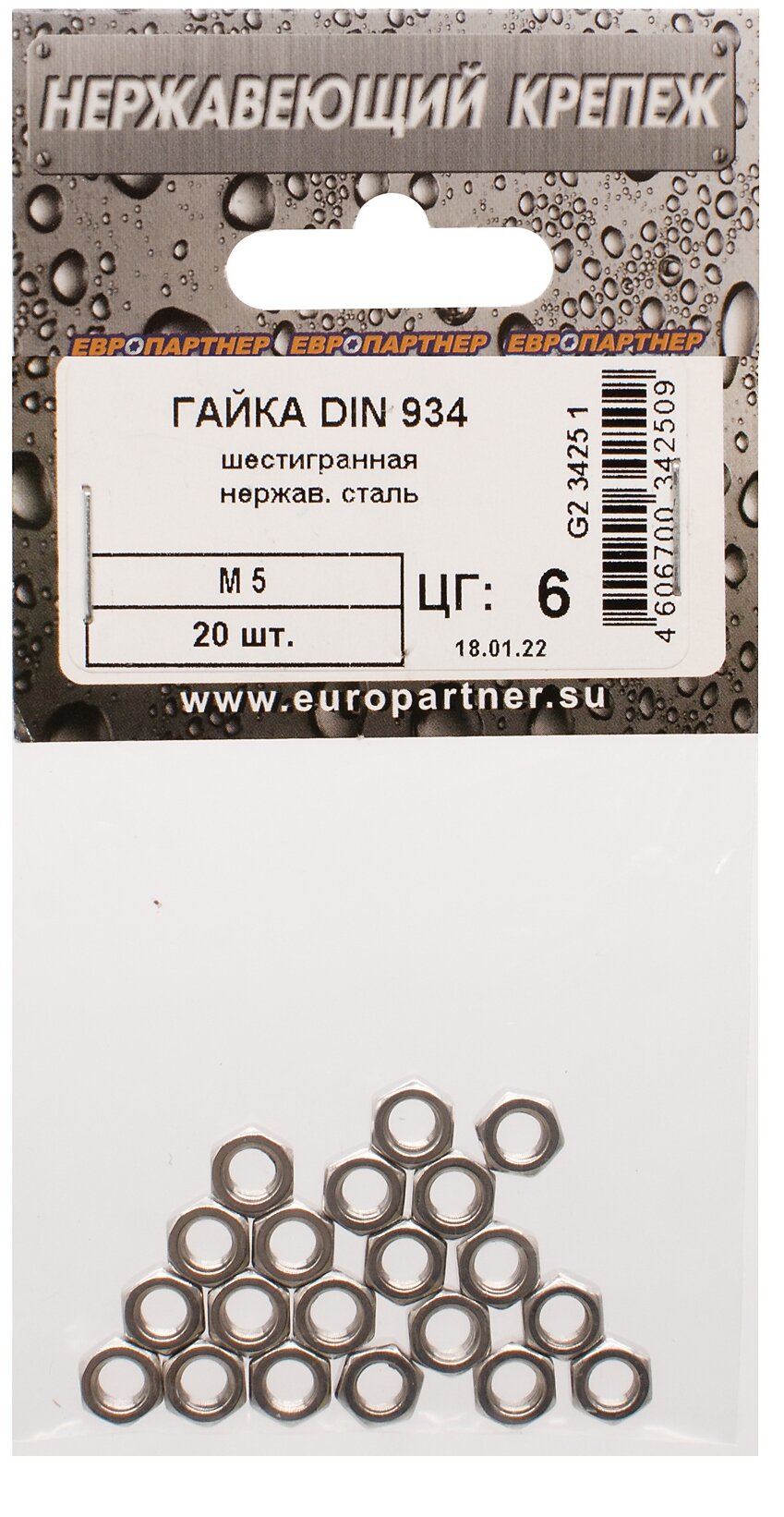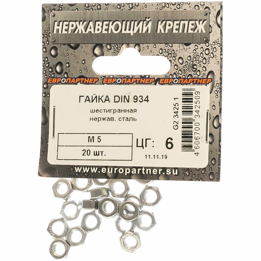Гайка шестигранная DIN 934 М5 20 штук Европартнер М5 DIN934 (20 шт.)