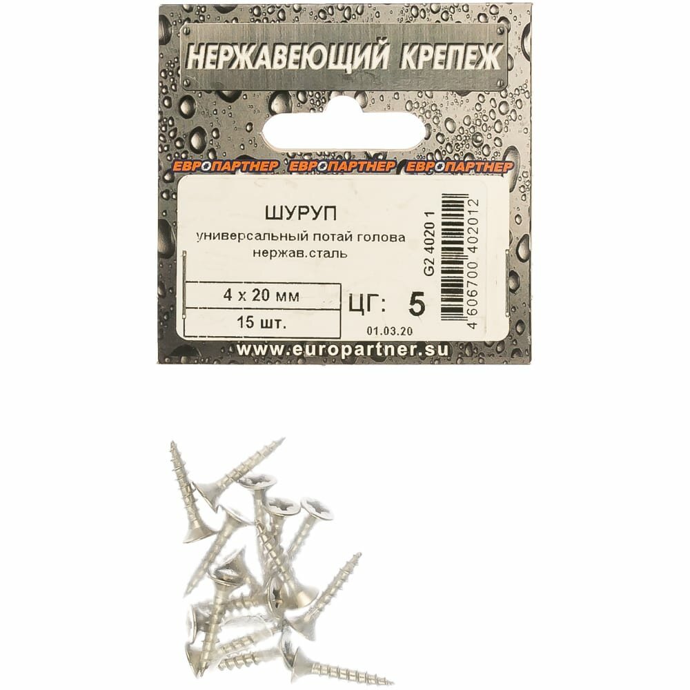 Шуруп универсальный с потайной головкой 4 х 20 15 штук Европартнер