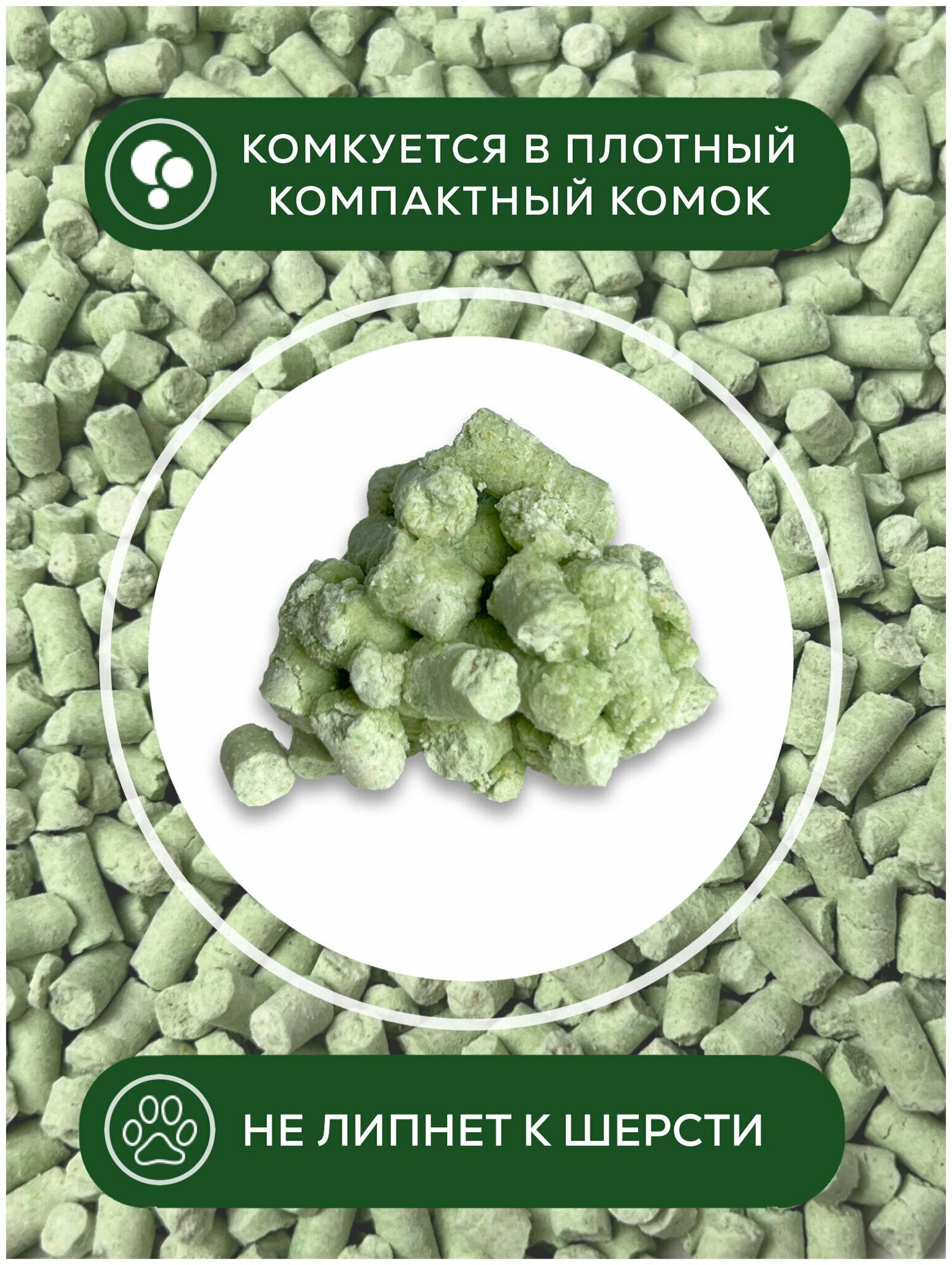 Натуральный комкующийся наполнитель на основе высококачественного сырья из отборных растительных волокон с ароматом Зеленого Чая. Основные свойства: - комкующийся (образует плотный эластичный комок, который очень легко удалить из общей массы наполнителя, не рассыпается и не застывает, соответственно, не прилипает намертво к стенкам и дну лотка; - 100% БИО-разлагаемый, компостируемый (благодаря натуральному составу разлагается полностью в почве не оставляя вредных веществ и отходов, может быть утилизирован путем компостирования, сжигания или выброшен в контейнер, как бытовые отходы); - разрешена утилизация в унитаз!!! (очень удобно для жителей квартир!!! Можно выбрасывать и смывать в туалет малыми порциями); - 100% натуральный состав ( в составе исключительно натуральные компоненты, растительные волокна, соевый белок, пищевые добавки для клейкости упругости полностью безопасен для животных, людей и окружающей среды) - Эффективно впитывает влагу ( не растекается и не протекает до дна, при условии правильного использования наполнителя); - блокирует неприятный запах ( за счет добавок препятствует размножению бактерий и грибков, а соответственно, дольше удерживает запах).
